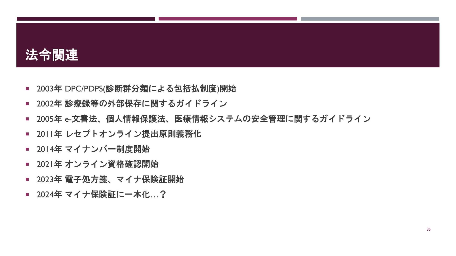 法令関連 2003年 DPC/PDPS(診断群分類による包括払制度)開始 2002年 診療録等の外部保存に関するガイドライン 2005年 e-文書法、個人情報保護法、医療情報システムの安全管理に関するガイドライン