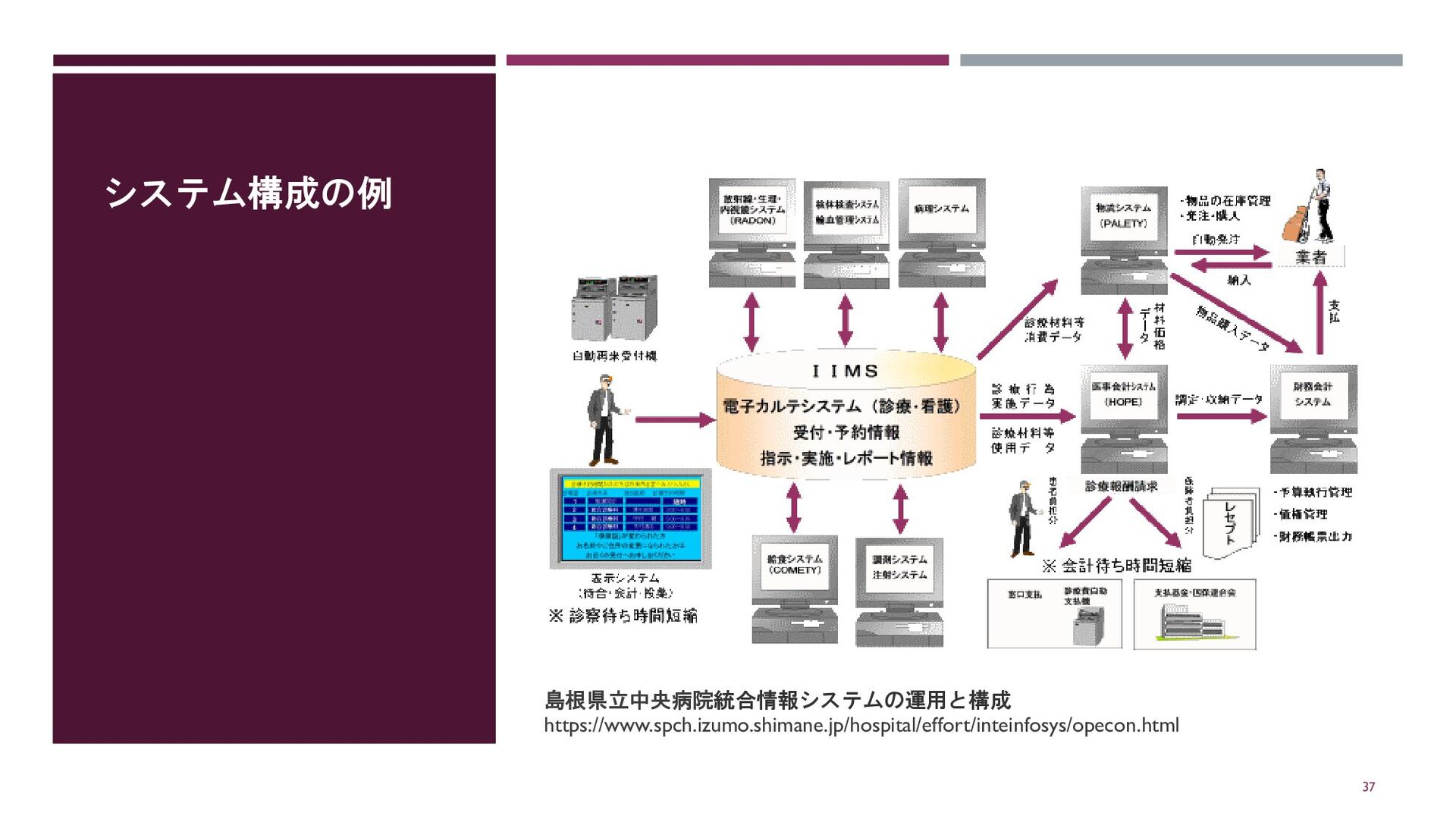 システム構成の例 37 島根県立中央病院統合情報システムの運用と構成 https://www.spch.izumo.shimane.jp/hospital/effort/inteinfosys/opecon.html