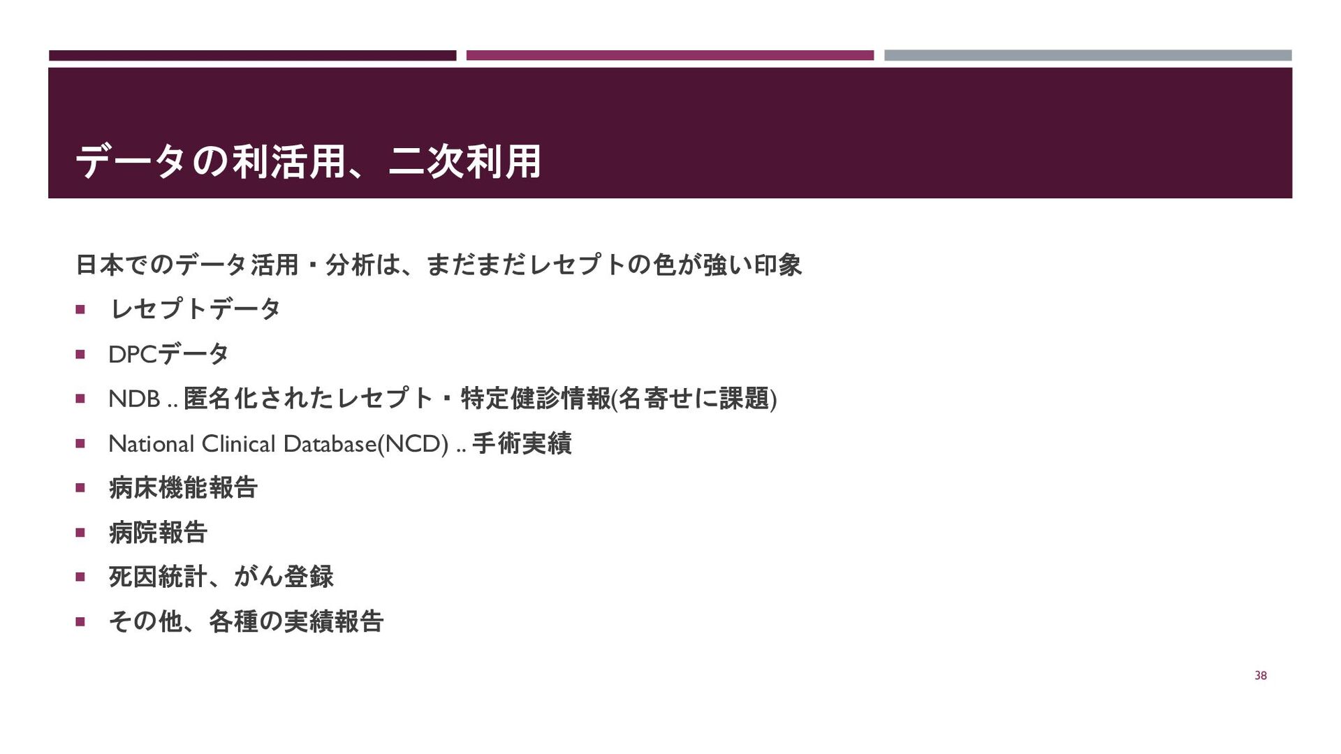 データの利活用、二次利用 日本でのデータ活用・分析は、まだまだレセプトの色が強い印象 レセプトデータ DPCデータ NDB .. 匿名化されたレセプト・特定健診情報(名寄せに課題)