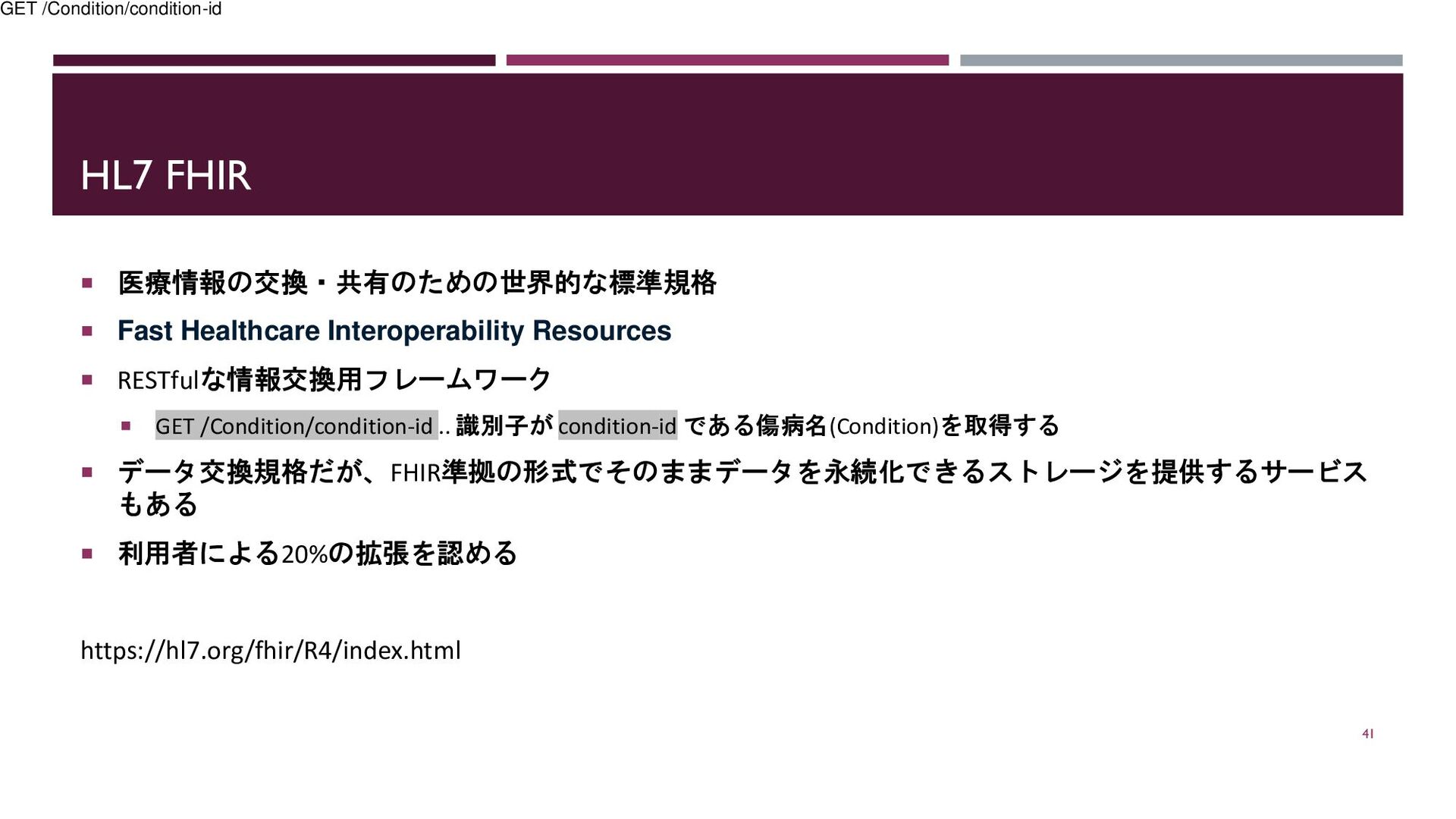 RESTfulな情報交換用フレームワーク GET /Condition/condition-id .. 識別子が condition-id である傷病名(Condition)を取得する データ交換規格だが、FHIR準拠の形式でそのままデータを永続化できるストレージを提供するサービス もある 利用者による20%の拡張を認める https://hl7.org/fhir/R4/index.html 41 GET /Condition/condition-id