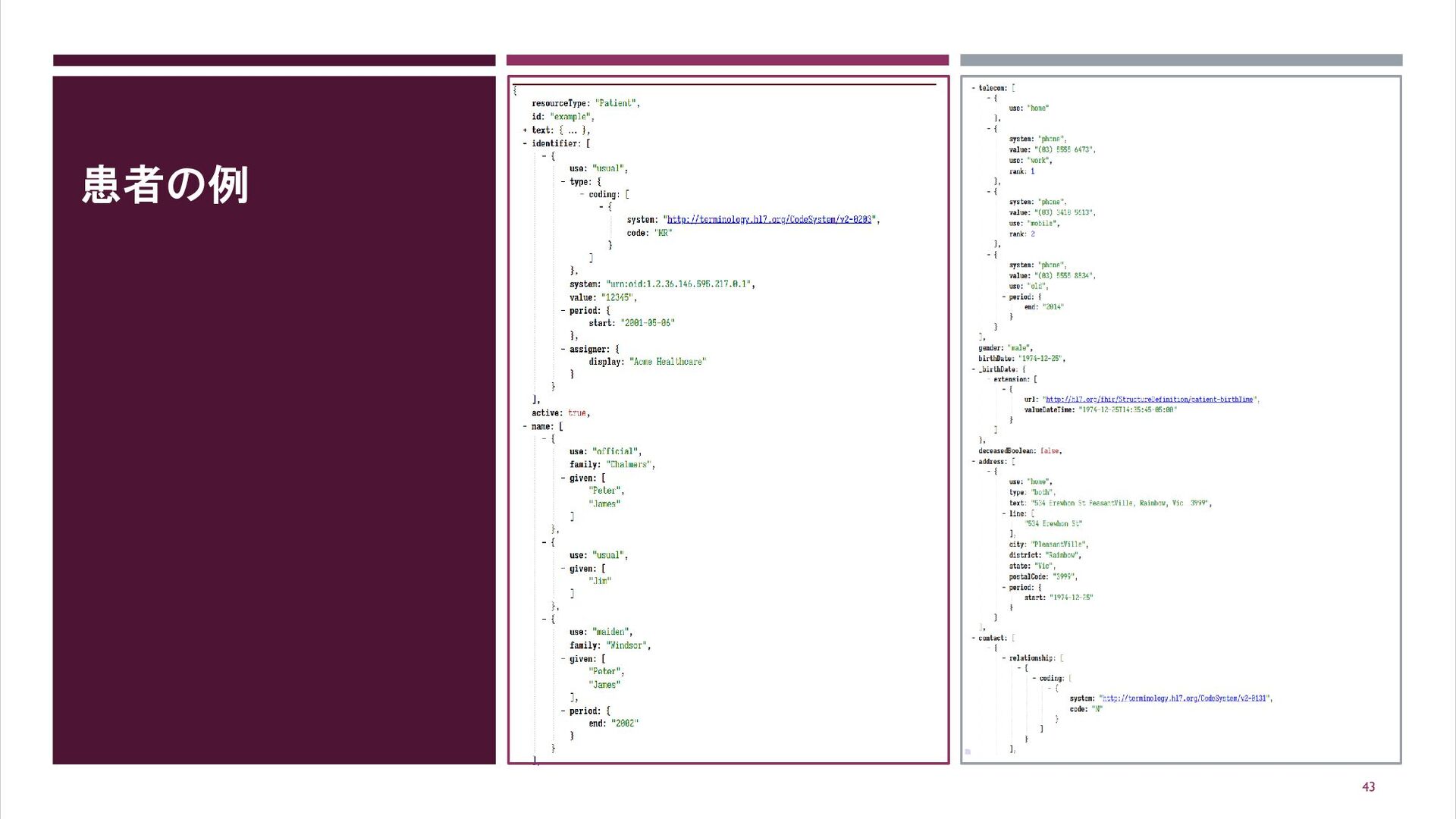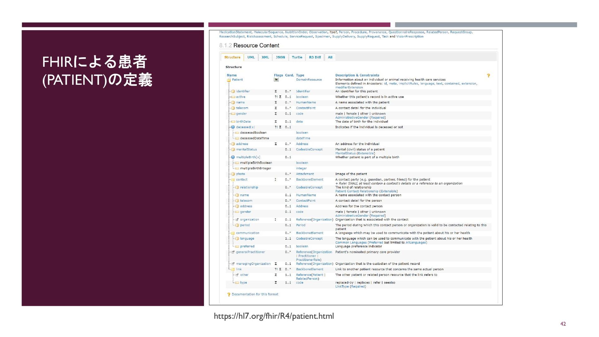 FHIRによる患者 (PATIENT)の定義 42 https://hl7.org/fhir/R4/patient.html