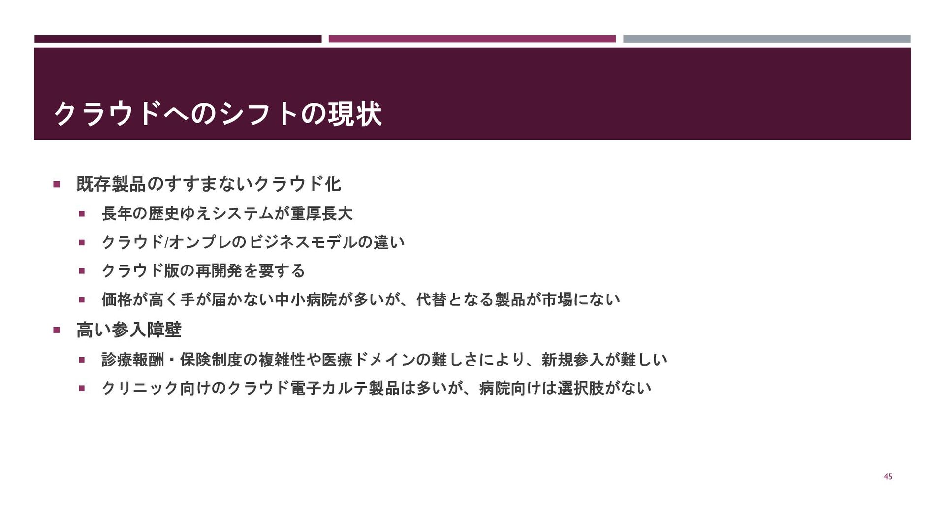 価格が高く手が届かない中小病院が多いが、代替となる製品が市場にない 高い参入障壁 診療報酬・保険制度の複雑性や医療ドメインの難しさにより、新規参入が難しい クリニック向けのクラウド電子カルテ製品は多いが、病院向けは選択肢がない 45