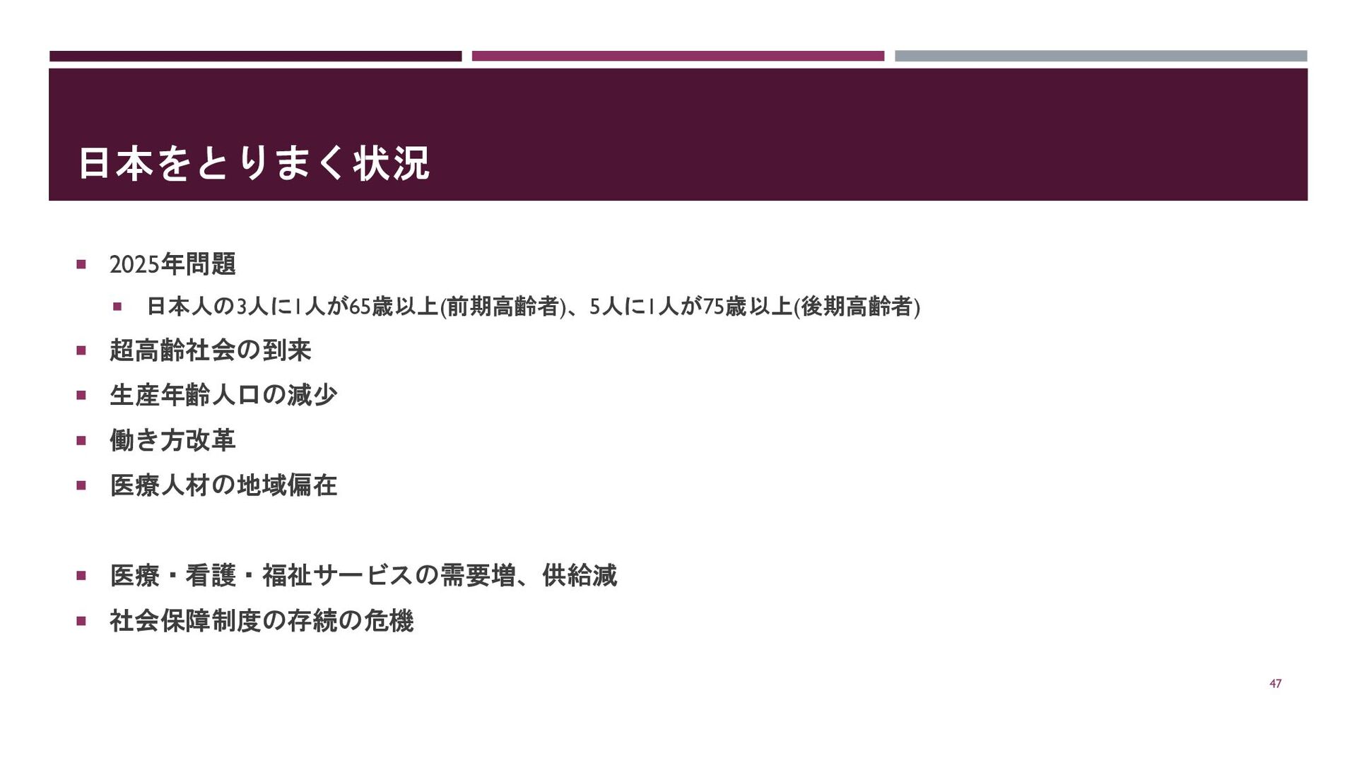 日本をとりまく状況 2025年問題 日本人の3人に1人が65歳以上(前期高齢者)、5人に1人が75歳以上(後期高齢者) 超高齢社会の到来 生産年齢人口の減少