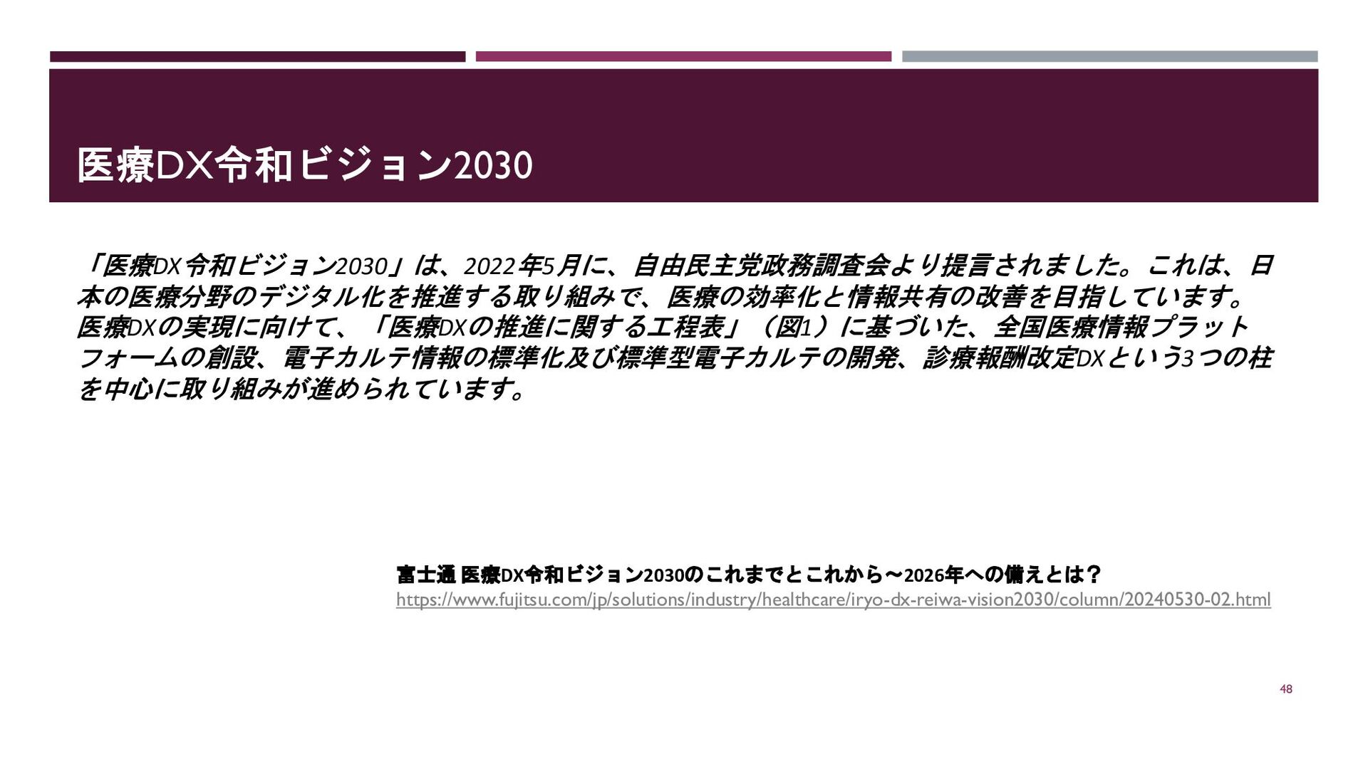 医療DX令和ビジョン2030 「医療DX令和ビジョン2030」は、2022年5月に、自由民主党政務調査会より提言されました。これは、日 本の医療分野のデジタル化を推進する取り組みで、医療の効率化と情報共有の改善を目指しています。 医療DXの実現に向けて、「医療DXの推進に関する工程表」(図1)に基づいた、全国医療情報プラット フォームの創設、電子カルテ情報の標準化及び標準型電子カルテの開発、診療報酬改定DXという3つの柱 を中心に取り組みが進められています。 48 富士通 医療DX令和ビジョン2030のこれまでとこれから~2026年への備えとは? https://www.fujitsu.com/jp/solutions/industry/healthcare/iryo-dx-reiwa-vision2030/column/20240530-02.html
