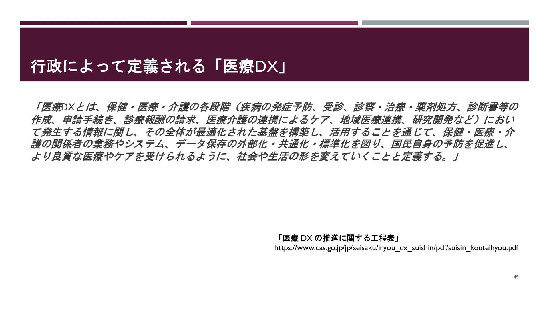 行政によって定義される「医療DX」 「医療DXとは、保健・医療・介護の各段階(疾病の発症予防、受診、診察・治療・薬剤処方、診断書等の 作成、申請手続き、診療報酬の請求、医療介護の連携によるケア、地域医療連携、研究開発など)におい て発生する情報に関し、その全体が最適化された基盤を構築し、活用することを通じて、保健・医療・介 護の関係者の業務やシステム、データ保存の外部化・共通化・標準化を図り、国民自身の予防を促進し、 より良質な医療やケアを受けられるように、社会や生活の形を変えていくことと定義する。」 49 「医療 DX の推進に関する工程表」