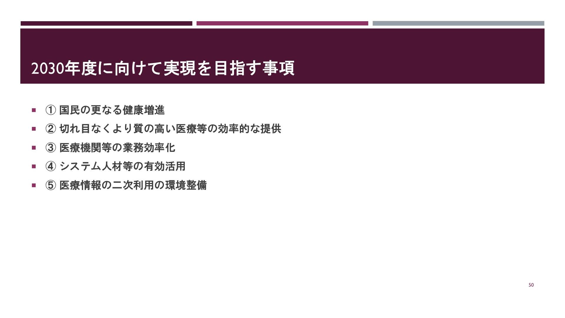 2030年度に向けて実現を目指す事項 ① 国民の更なる健康増進 ② 切れ目なくより質の高い医療等の効率的な提供 ③ 医療機関等の業務効率化