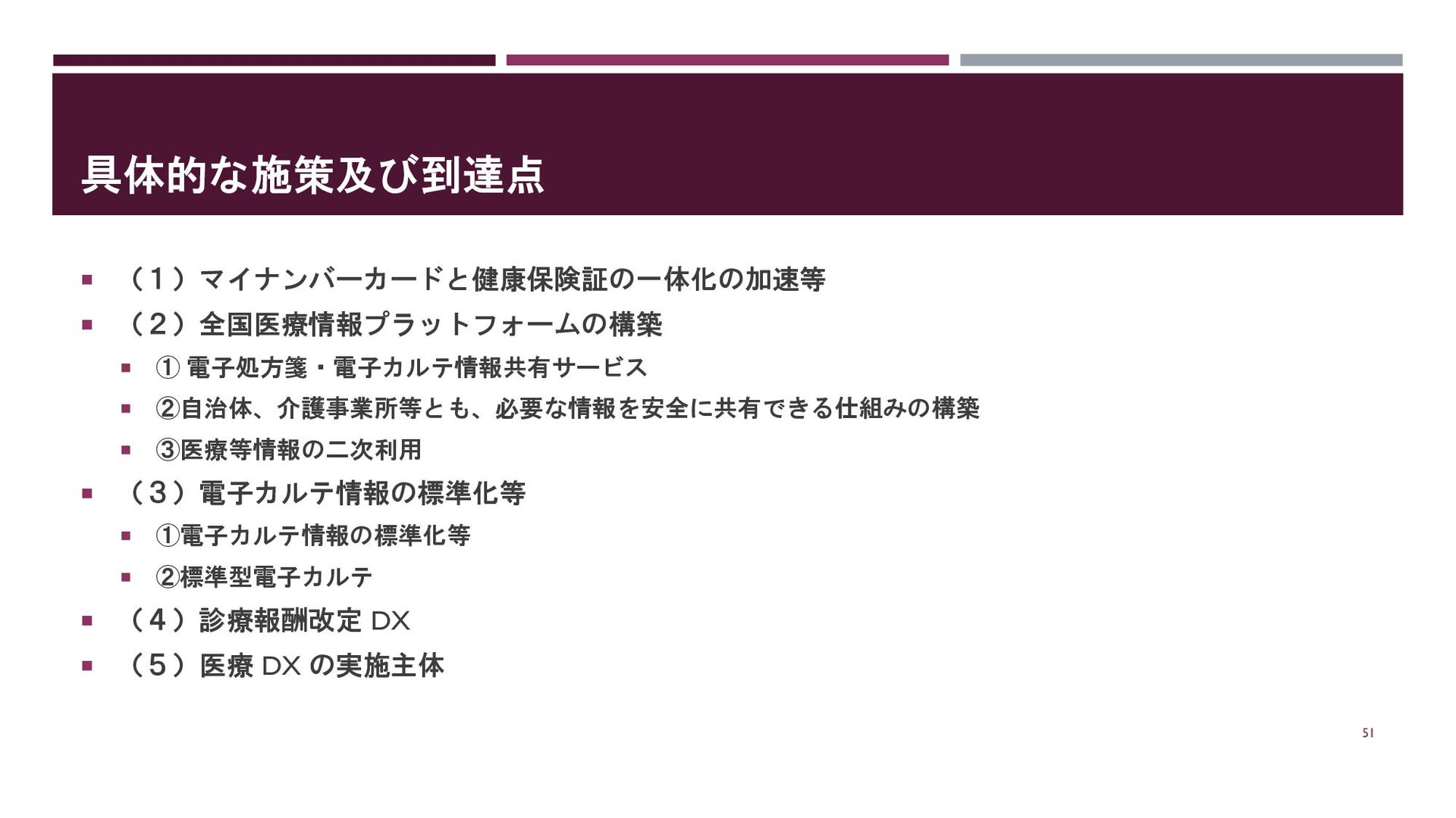 ③医療等情報の二次利用 (3)電子カルテ情報の標準化等 ①電子カルテ情報の標準化等 ②標準型電子カルテ (4)診療報酬改定 DX (5)医療 DX の実施主体 51