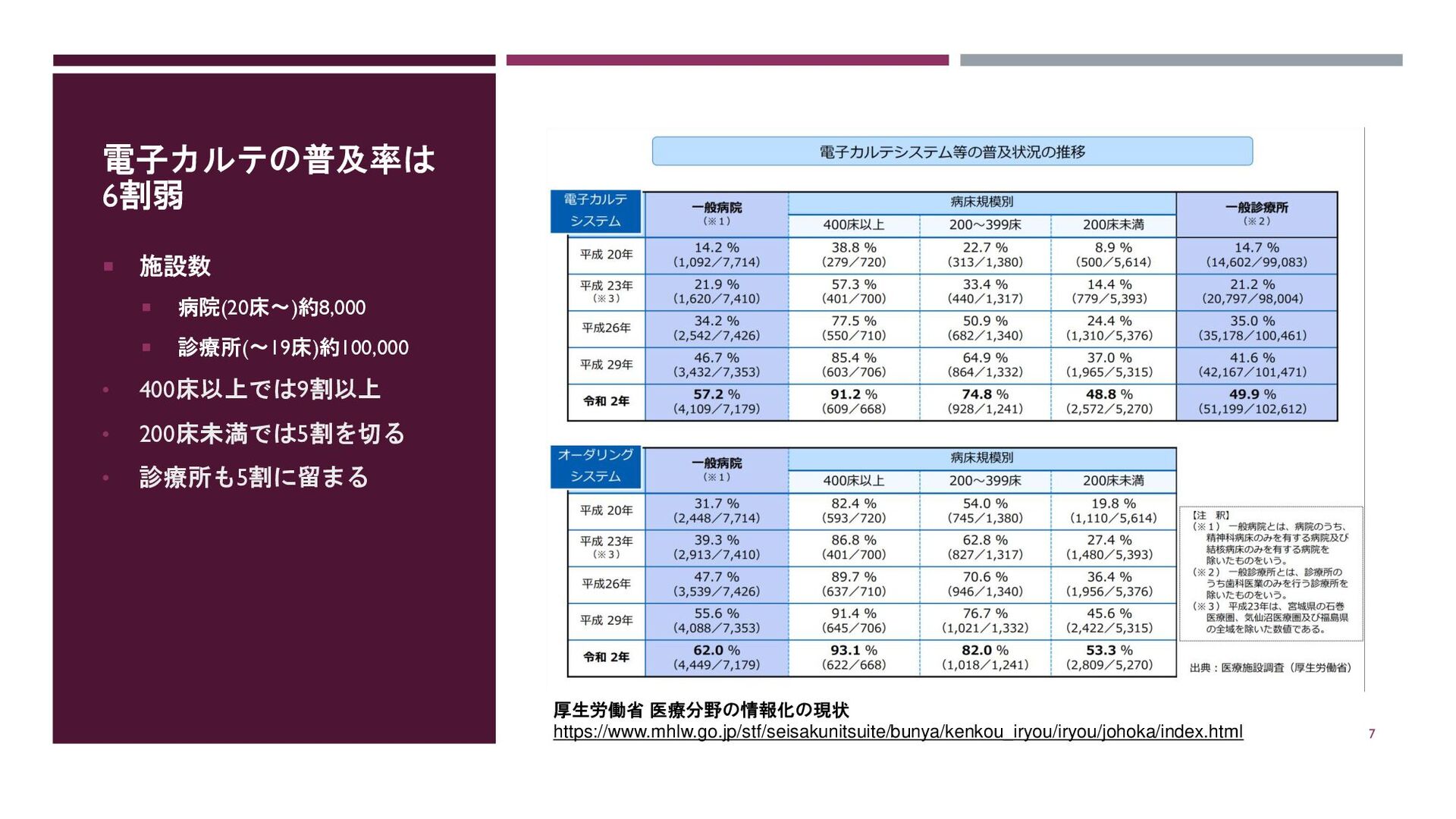 • 200床未満では5割を切る • 診療所も5割に留まる 厚生労働省 医療分野の情報化の現状 https://www.mhlw.go.jp/stf/seisakunitsuite/bunya/kenkou_iryou/iryou/johoka/index.html 7