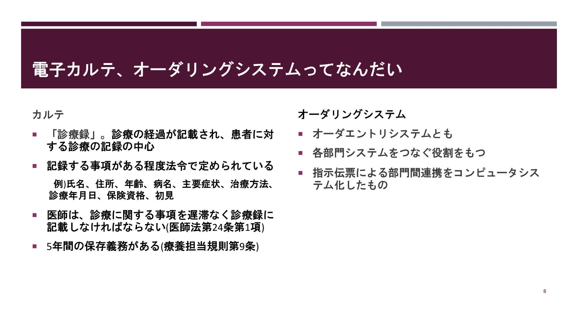 医師は、診療に関する事項を遅滞なく診療録に 記載しなければならない(医師法第24条第1項) 5年間の保存義務がある(療養担当規則第9条) オーダリングシステム オーダエントリシステムとも 各部門システムをつなぐ役割をもつ 指示伝票による部門間連携をコンピュータシス テム化したもの 8