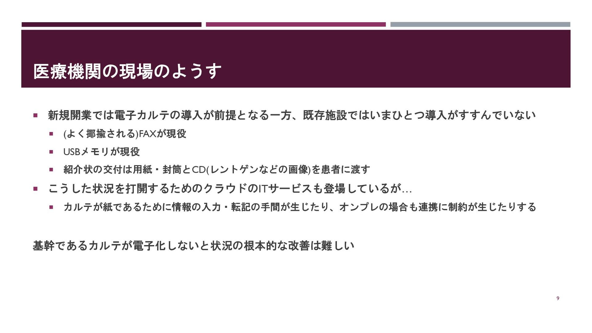 医療機関の現場のようす 新規開業では電子カルテの導入が前提となる一方、既存施設ではいまひとつ導入がすすんでいない (よく揶揄される)FAXが現役 USBメモリが現役 紹介状の交付は用紙・封筒とCD(レントゲンなどの画像)を患者に渡す