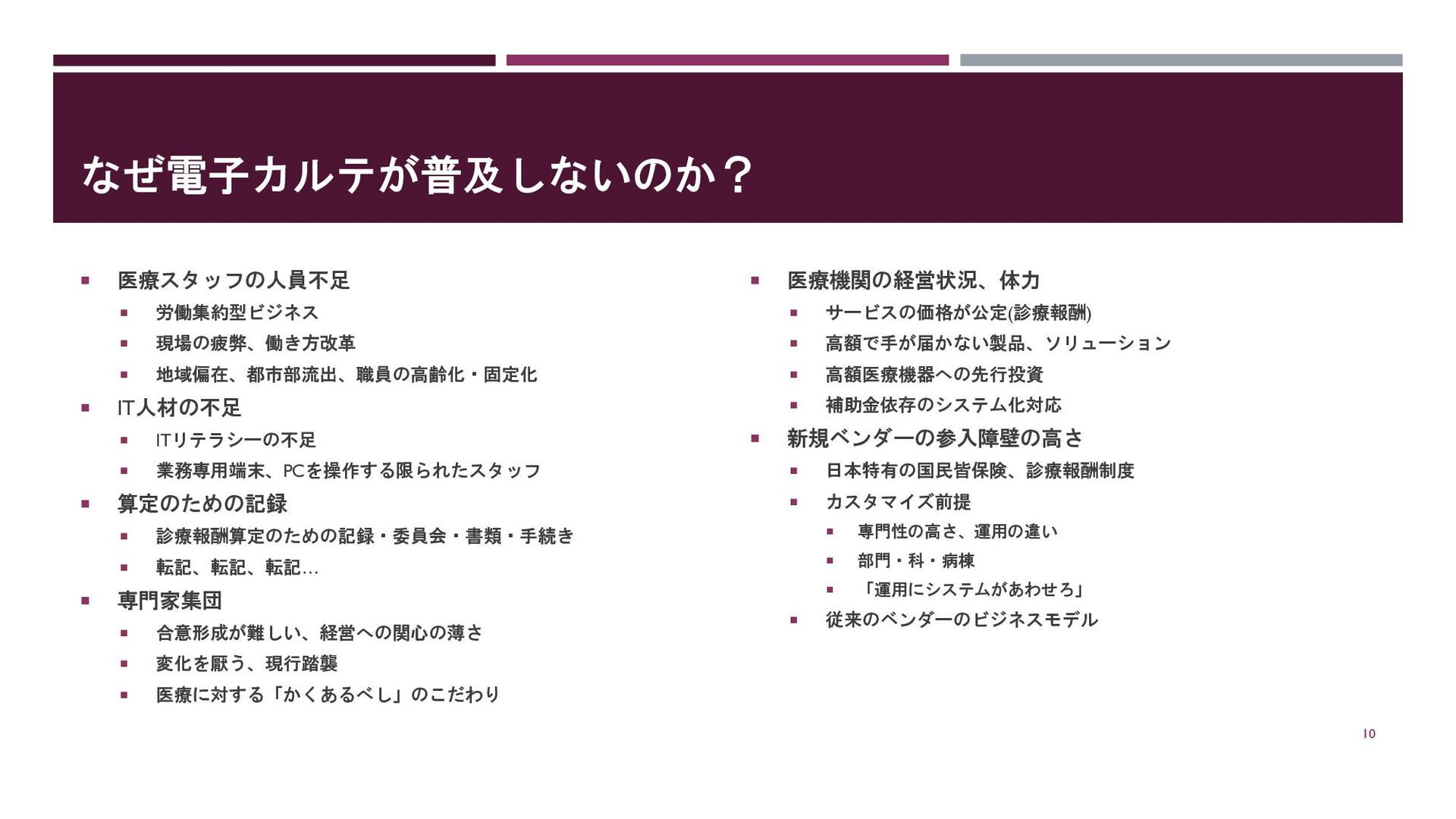 こうした状況を打開するためのクラウドのITサービスも登場しているが… カルテが紙であるために情報の入力・転記の手間が生じたり、オンプレの場合も連携に制約が生じたりする 基幹であるカルテが電子化しないと状況の根本的な改善は難しい 9