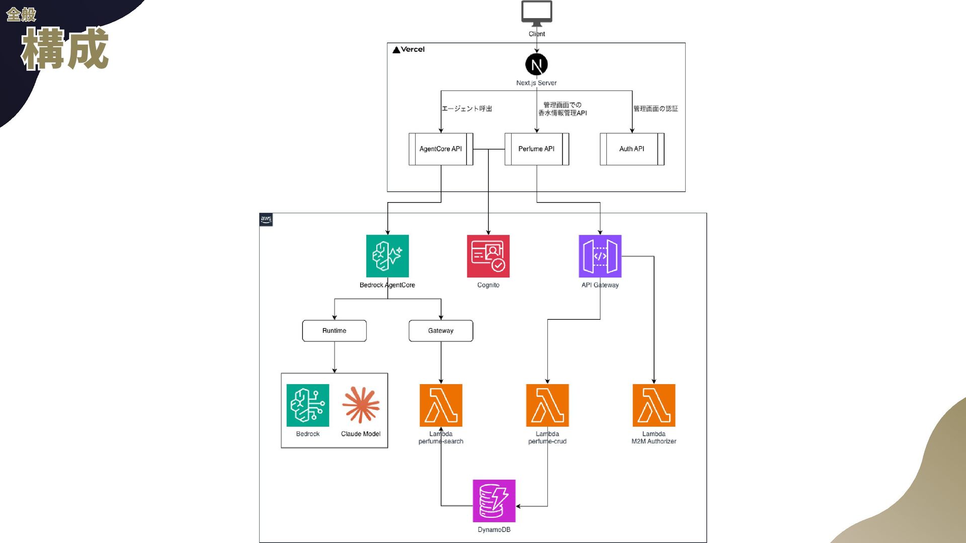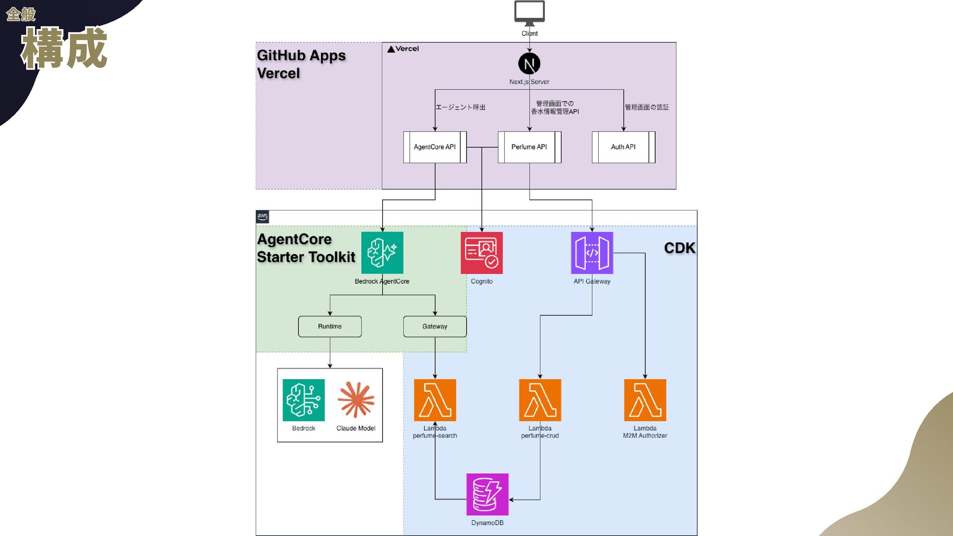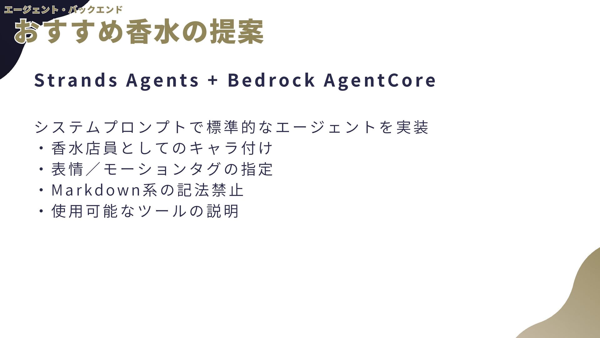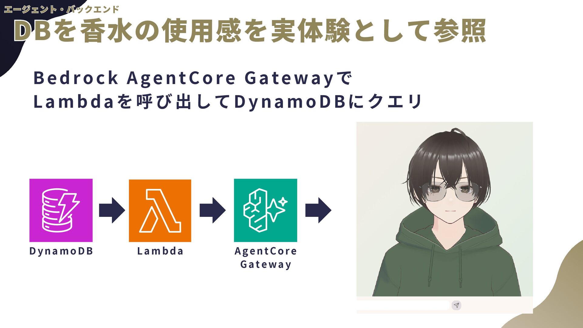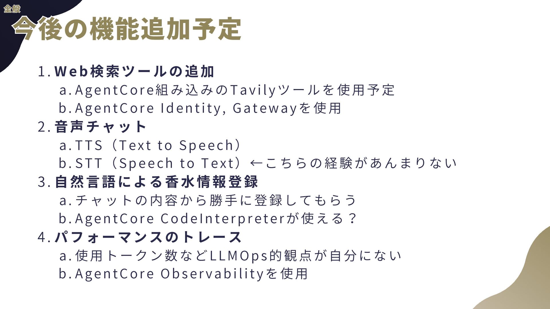 ー ル の 追 加 a . AgentCore組み込みのTavil yツールを使用予定 b . AgentCore Identity, Gatewayを使用 2 . 音 声 チ ャ ッ ト a . TTS(Text to Speech) b . STT(Speech to Text)←こちらの経験があんまりない 3 . 自 然 言 語 に よ る 香 水 情 報 登 録 a . チャットの内容から勝手に登録してもらう b . AgentCore CodeInterpreterが使える? 4 . パ フ ォ ー マ ン ス の ト レ ー ス a . 使用トークン数などLLMOps的観点が自分にない b . AgentCore Observabil ityを使用 全般 全般