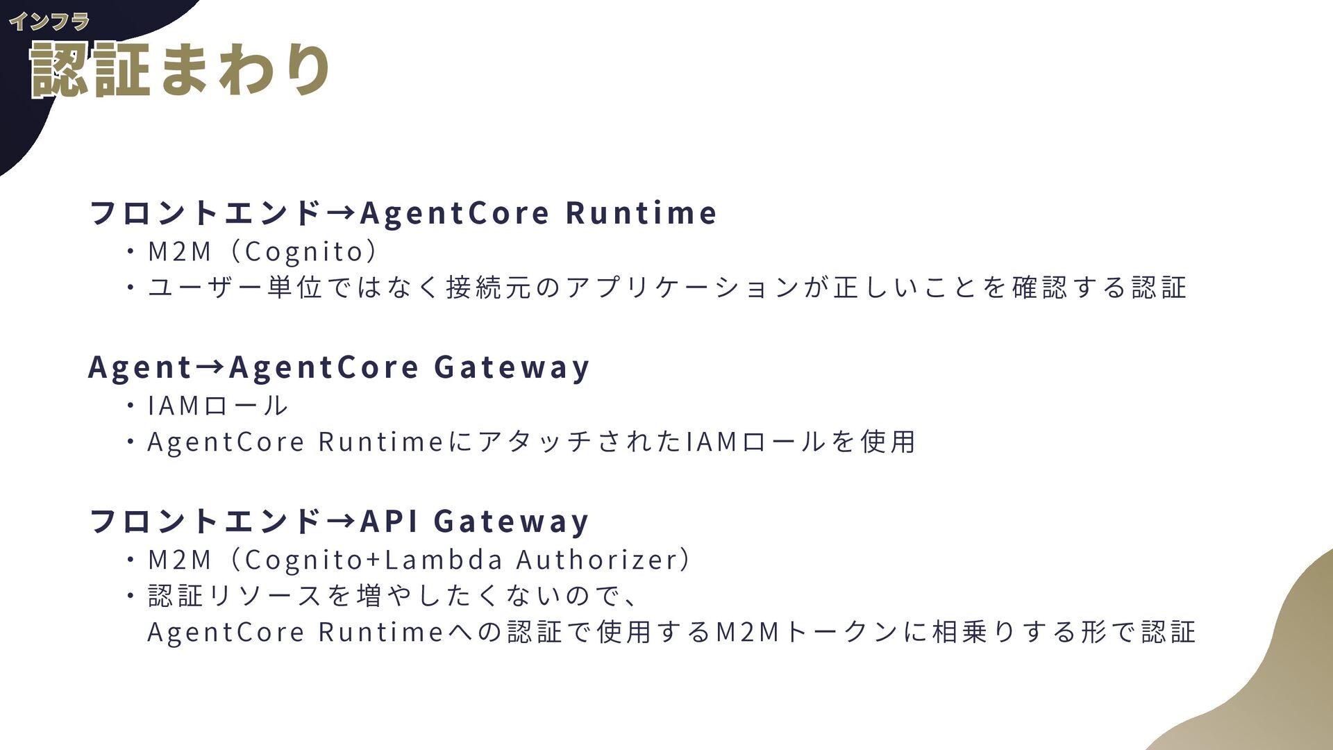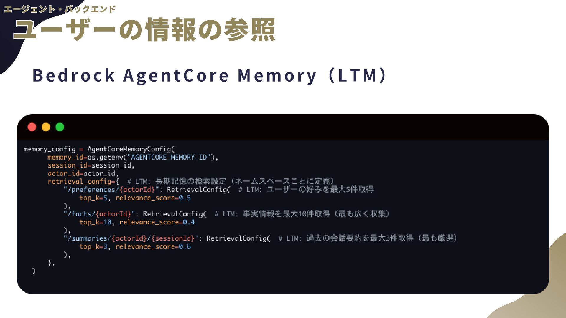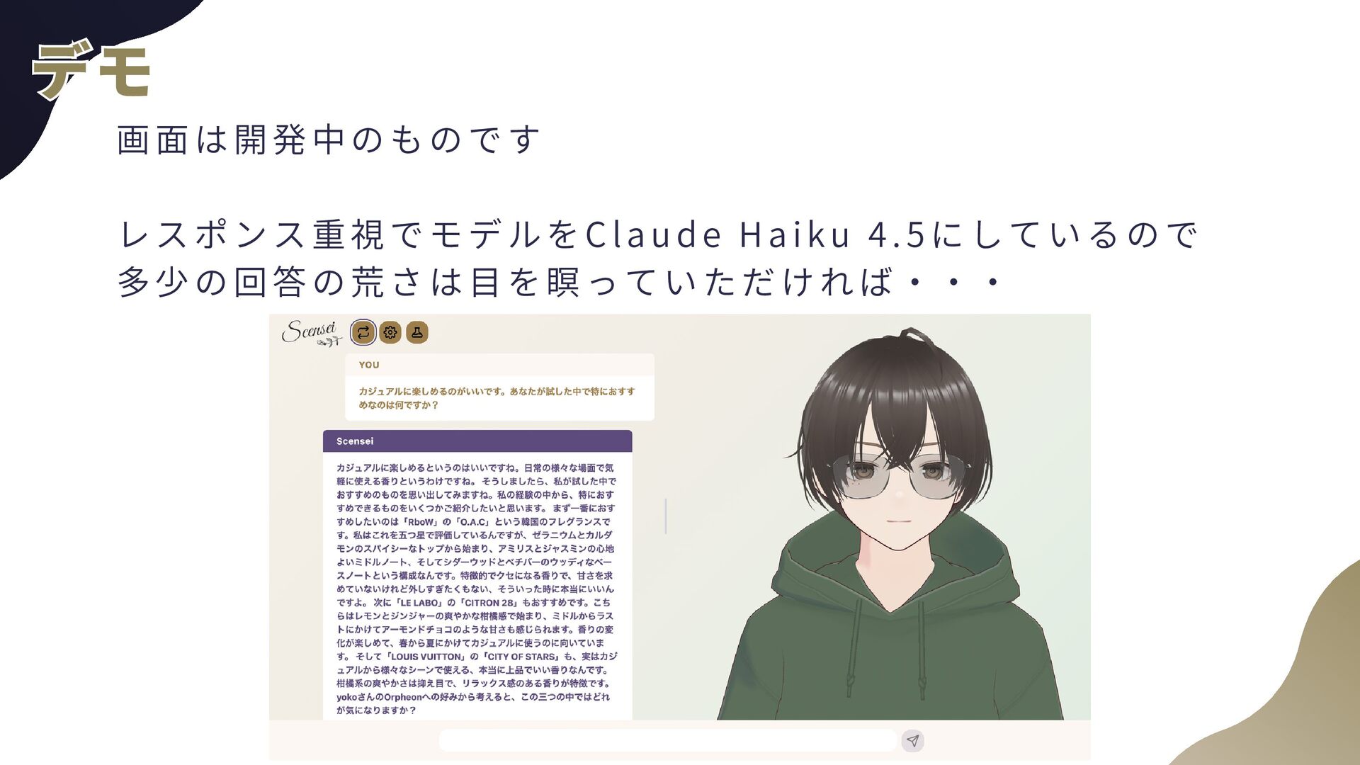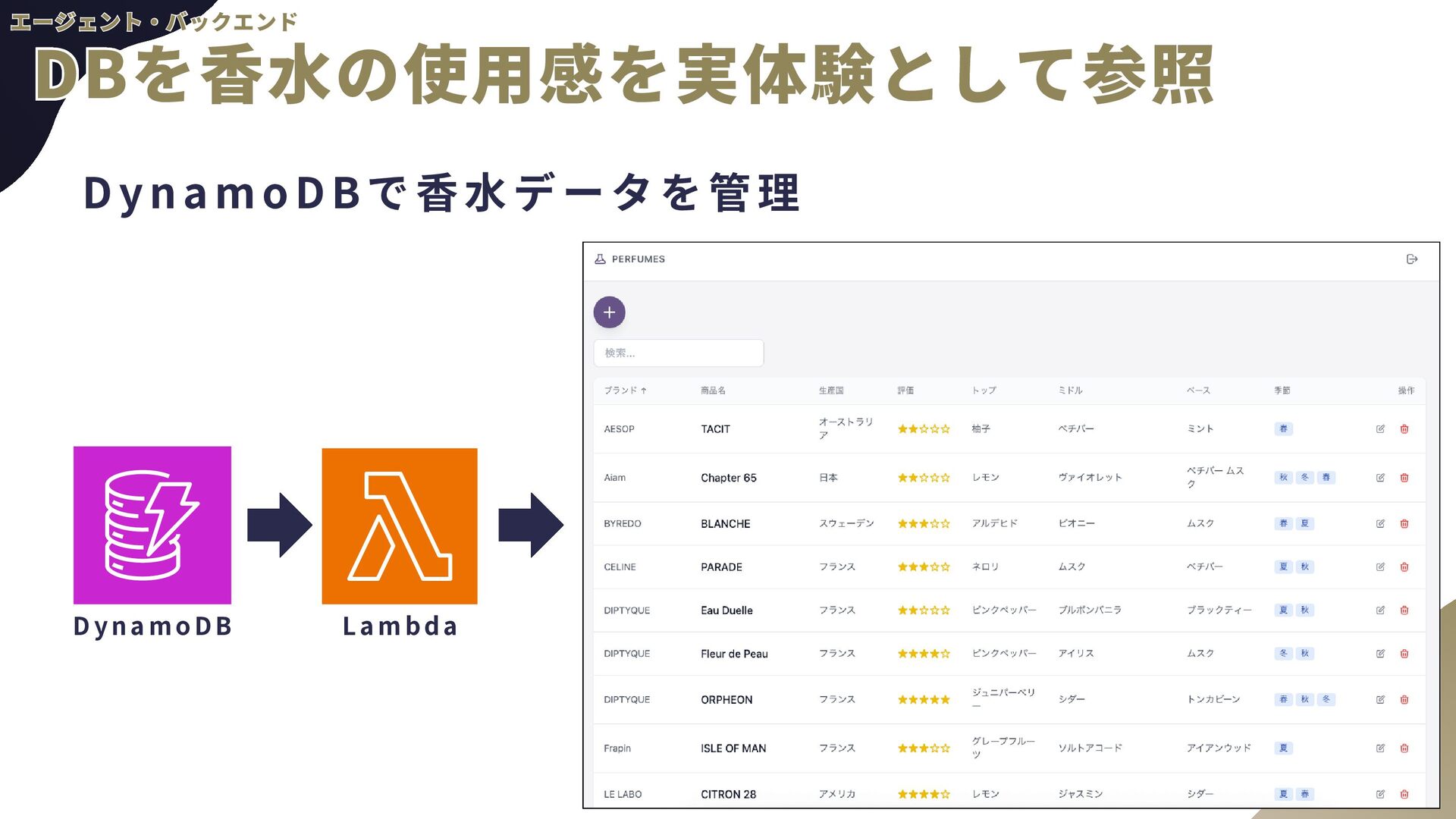 ー ル の 追 加 a . AgentCore組み込みのTavil yツールを使用予定 b . AgentCore Identity, Gatewayを使用 2 . 音 声 チ ャ ッ ト a . TTS(Text to Speech) b . STT(Speech to Text)←こちらの経験があんまりない 3 . 自 然 言 語 に よ る 香 水 情 報 登 録 a . チャットの内容から勝手に登録してもらう b . AgentCore CodeInterpreterが使える? 4 . パ フ ォ ー マ ン ス の ト レ ー ス a . 使用トークン数などLLMOps的観点が自分にない b . AgentCore Observabil ityを使用 全般 全般