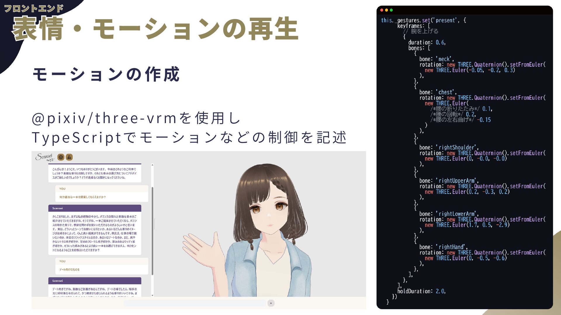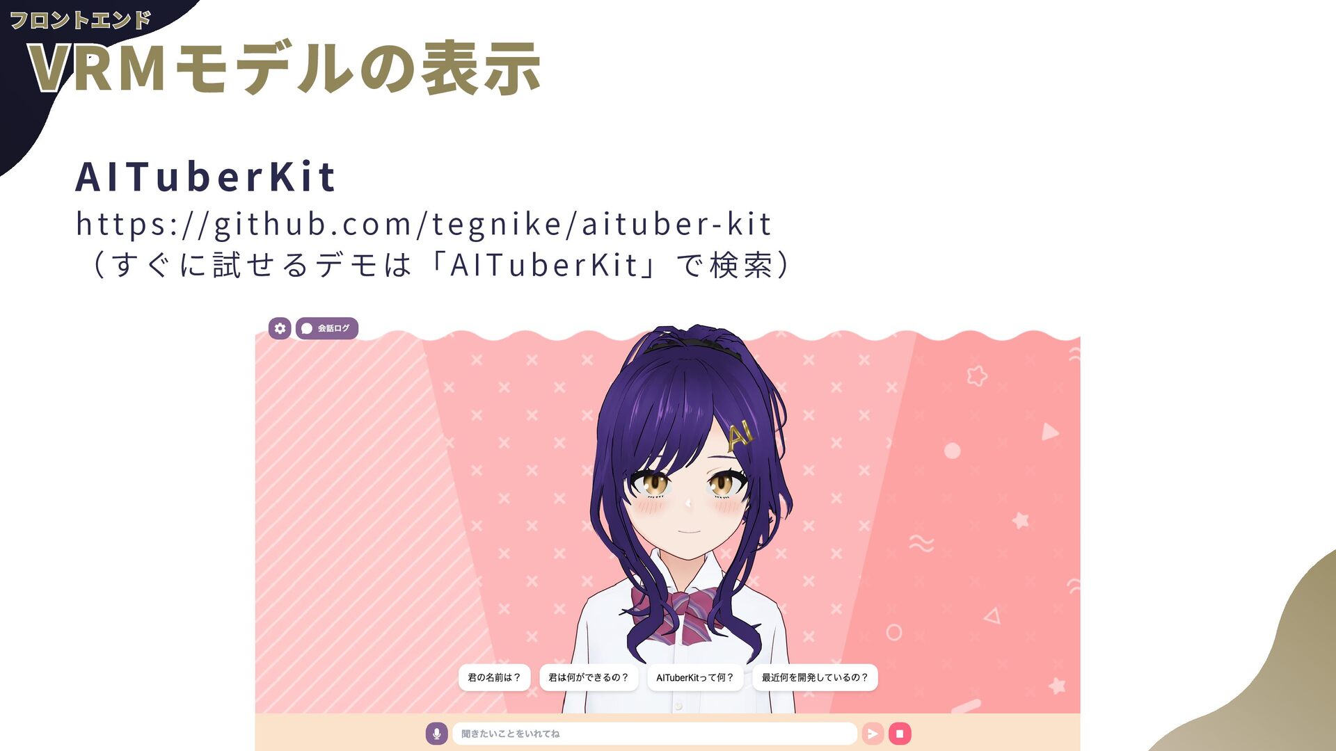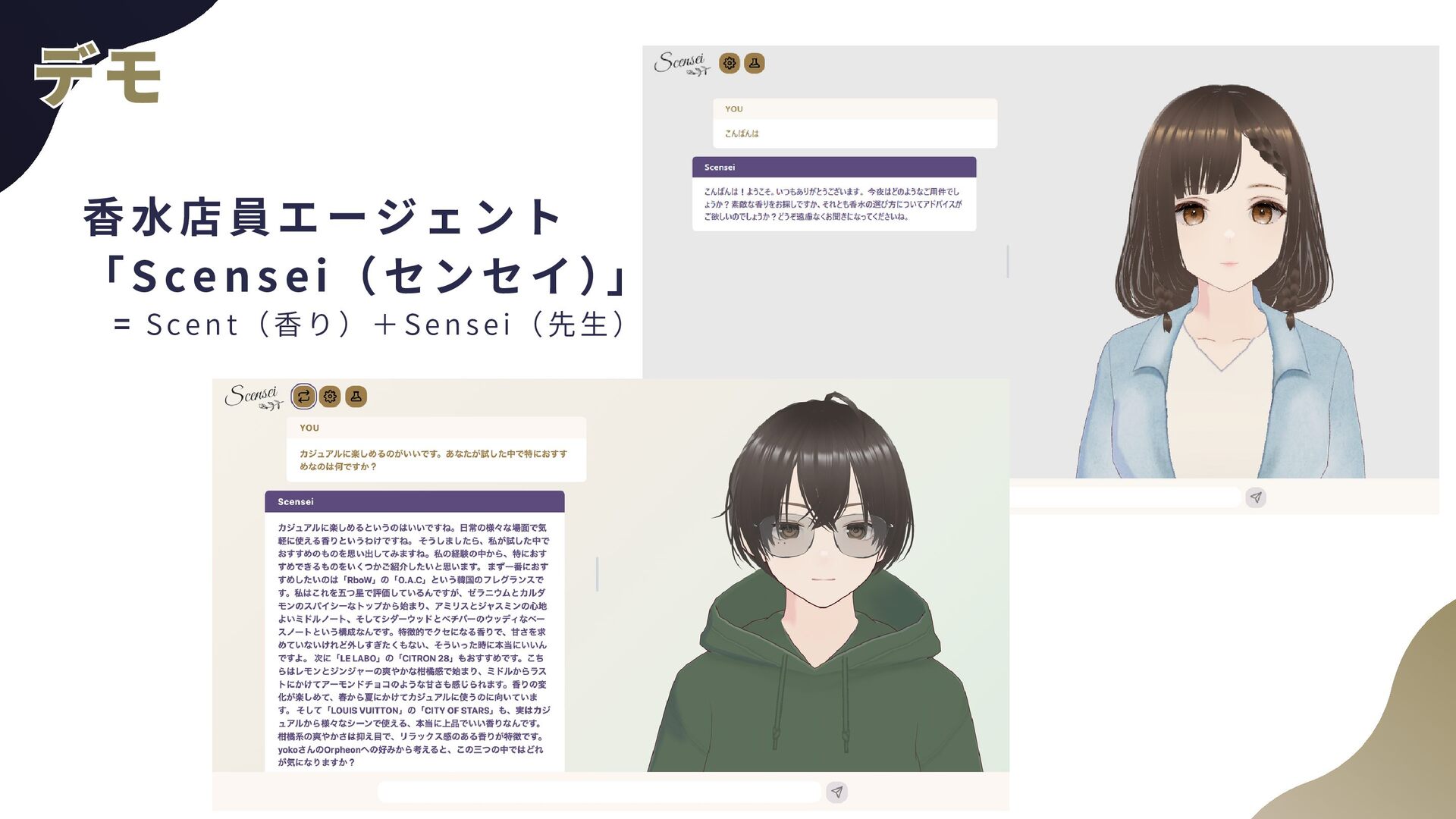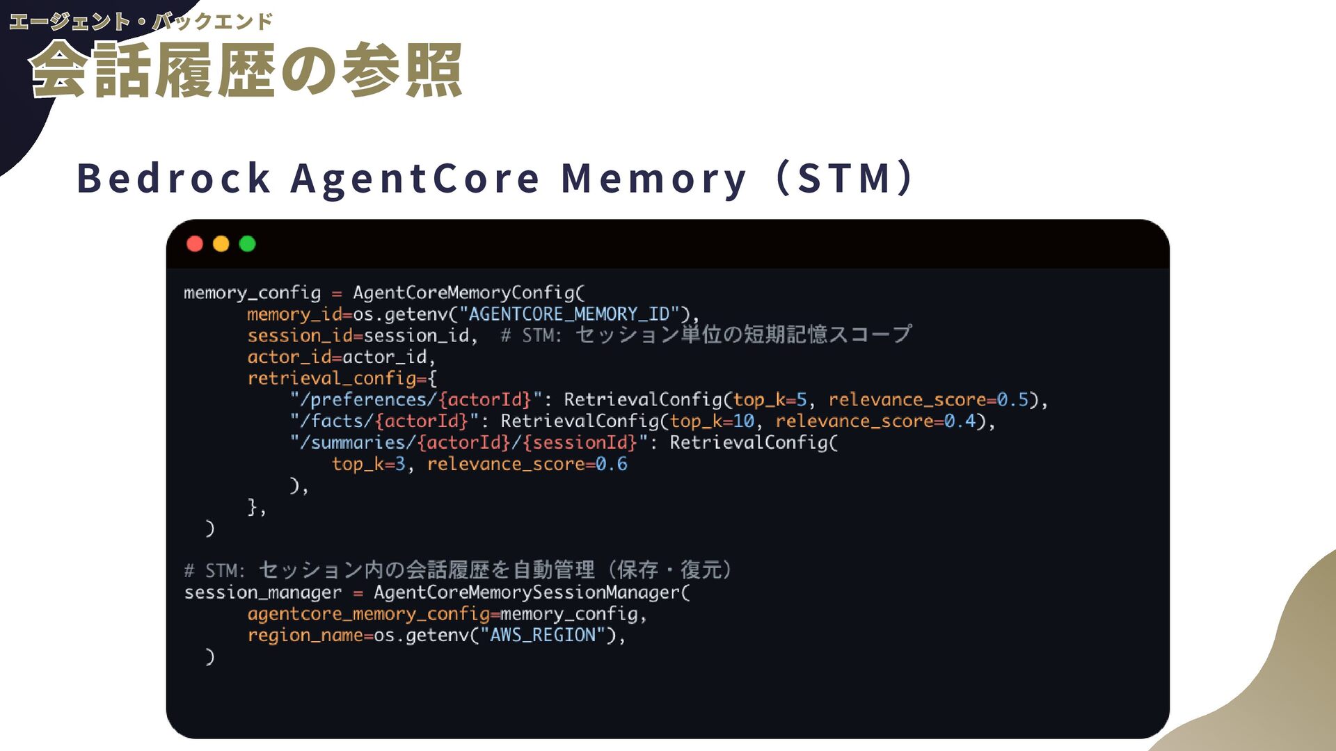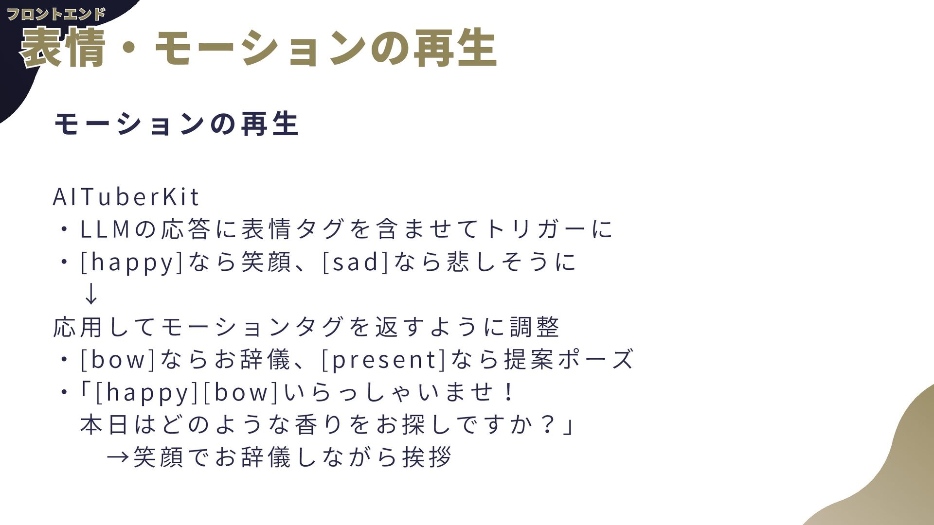 ー ル の 追 加 a . AgentCore組み込みのTavil yツールを使用予定 b . AgentCore Identity, Gatewayを使用 2 . 音 声 チ ャ ッ ト a . TTS(Text to Speech) b . STT(Speech to Text)←こちらの経験があんまりない 3 . 自 然 言 語 に よ る 香 水 情 報 登 録 a . チャットの内容から勝手に登録してもらう b . AgentCore CodeInterpreterが使える? 4 . パ フ ォ ー マ ン ス の ト レ ー ス a . 使用トークン数などLLMOps的観点が自分にない b . AgentCore Observabil ityを使用 全般 全般