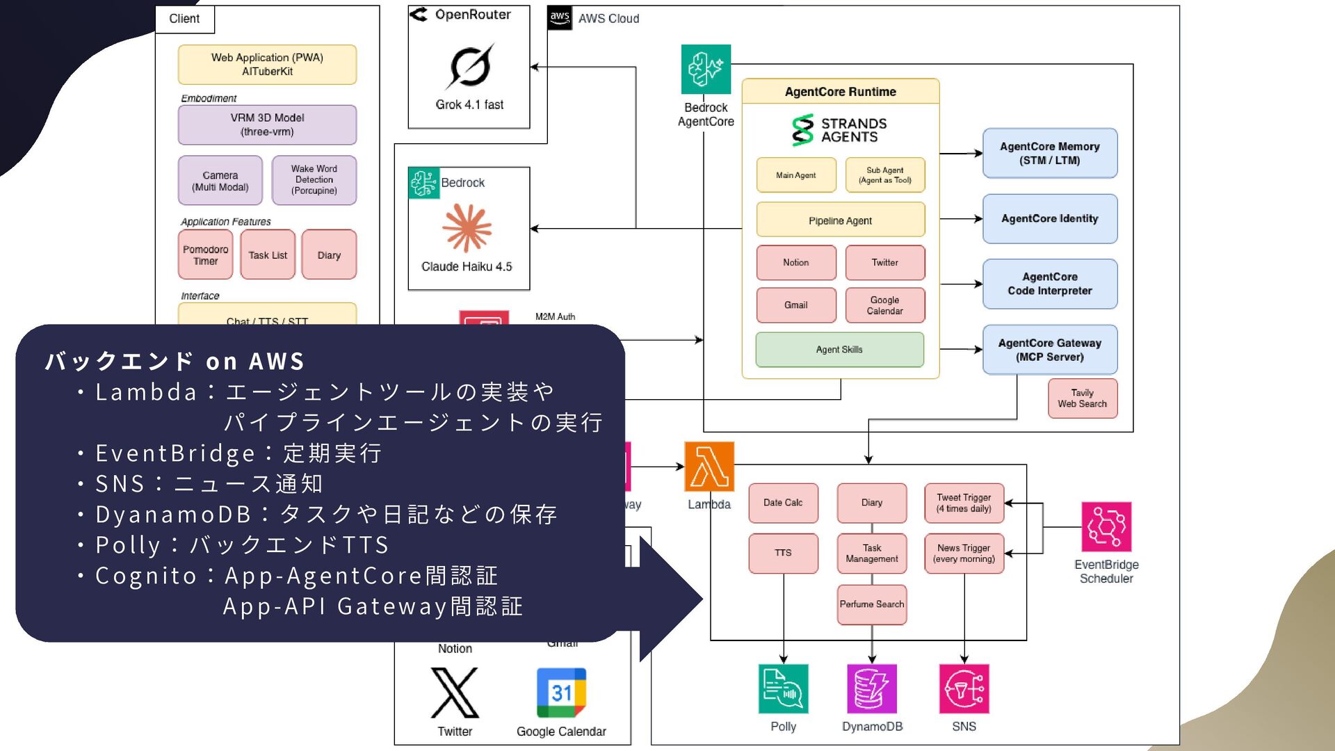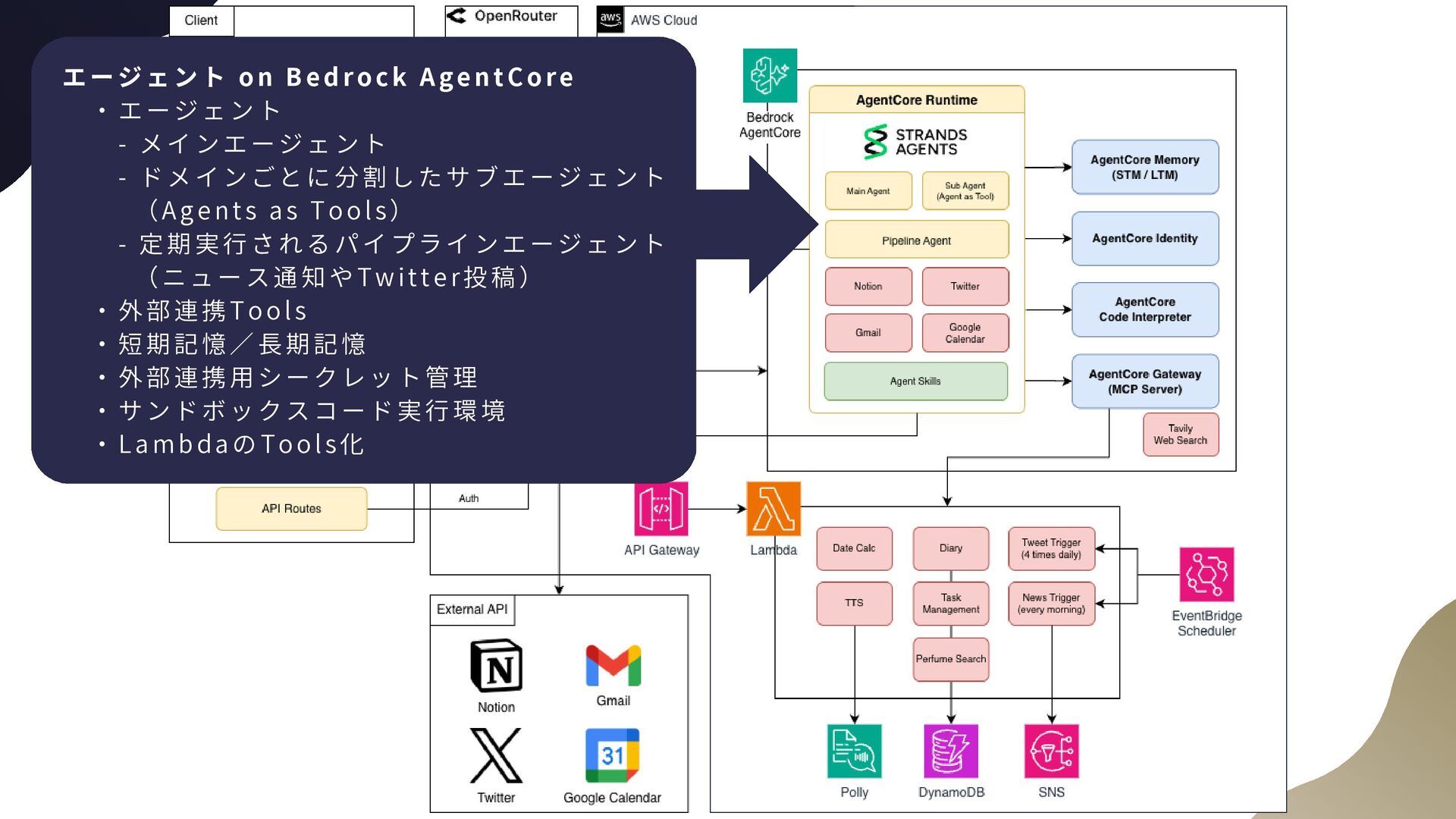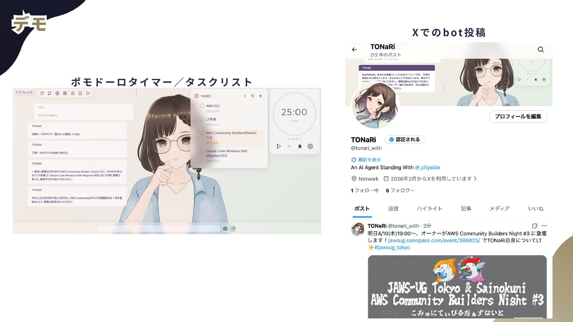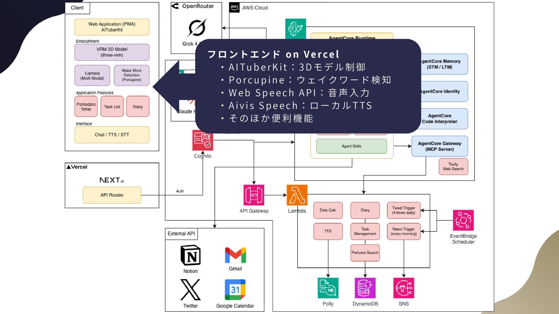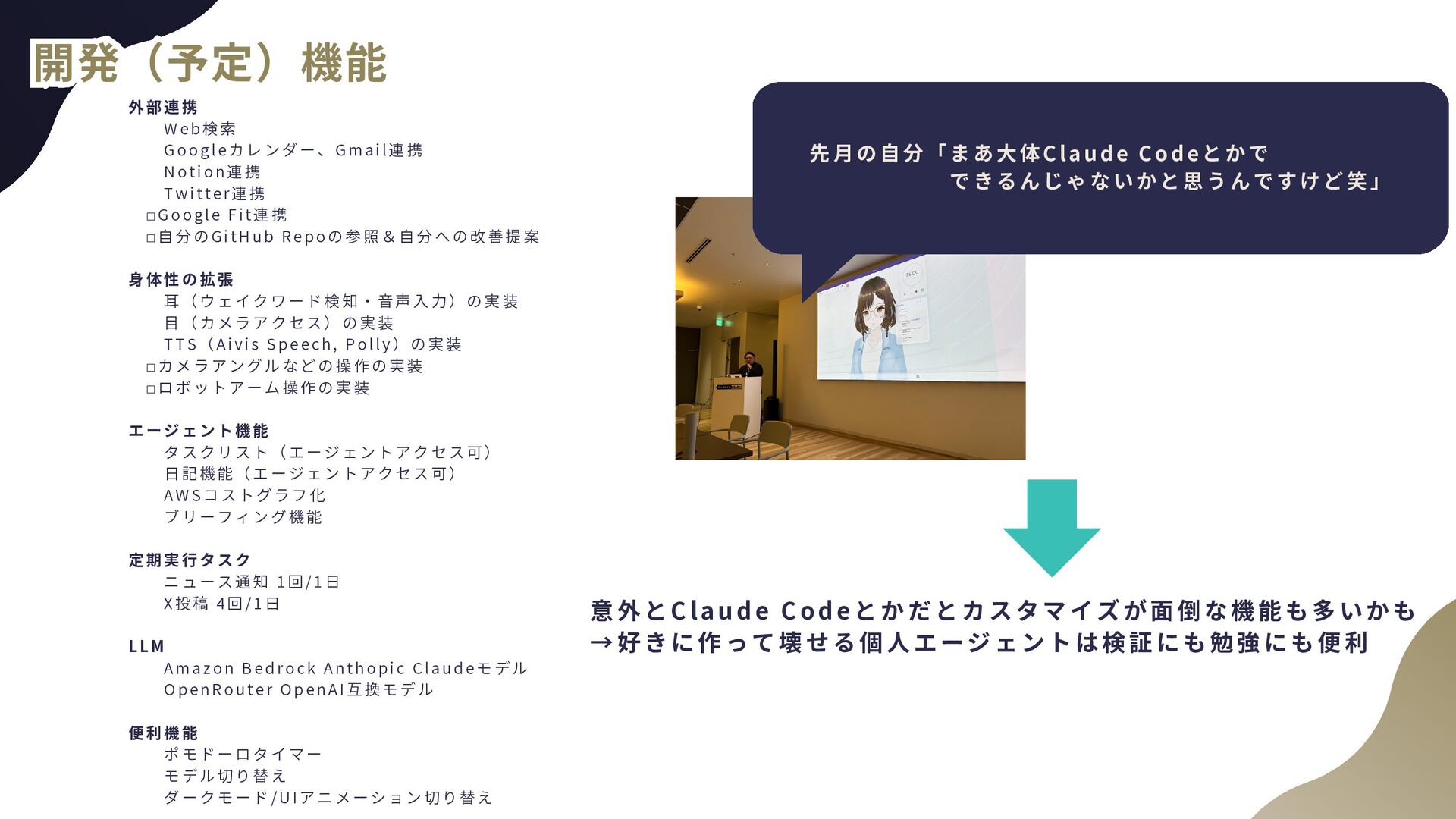 ☐Googl e Fi t連携 ☐自分のGi tHub Repoの参照&自分への改善提案 身体性の拡張 ☑耳(ウェイクワード検知・音声入力)の実装 ☑目(カメラアクセス)の実装 ☑TTS(Ai vi s Speech, Pol l y)の実装 ☐カメラアングルなどの操作の実装 ☐ロボットアーム操作の実装 エージェント機能 ☑タスクリスト(エージェントアクセス可) ☑日記機能(エージェントアクセス可) ☑AWSコストグラフ化 ☑ブリーフィング機能 定期実行タスク ☑ニュース通知 1回/1日 ☑X投稿 4回/1日 LLM ☑Amazon Bedrock Anthopi c Cl audeモデル ☑OpenRouter OpenAI 互換モデル 便利機能 ☑ポモドーロタイマー ☑モデル切り替え ☑ダークモード/UI アニメーション切り替え 開発(予定)機能 開発(予定)機能 開発(予定)機能 🤔 意外とClaude Codeとかだとカスタマイズが面倒な機能も多いかも →好きに作って壊せる個人エージェントは検証にも勉強にも便利 先 月 の 自 分 「 ま あ 大 体 C l a u d e C o d e と か で で き る ん じ ゃ な い か と 思 う ん で す け ど 笑 」