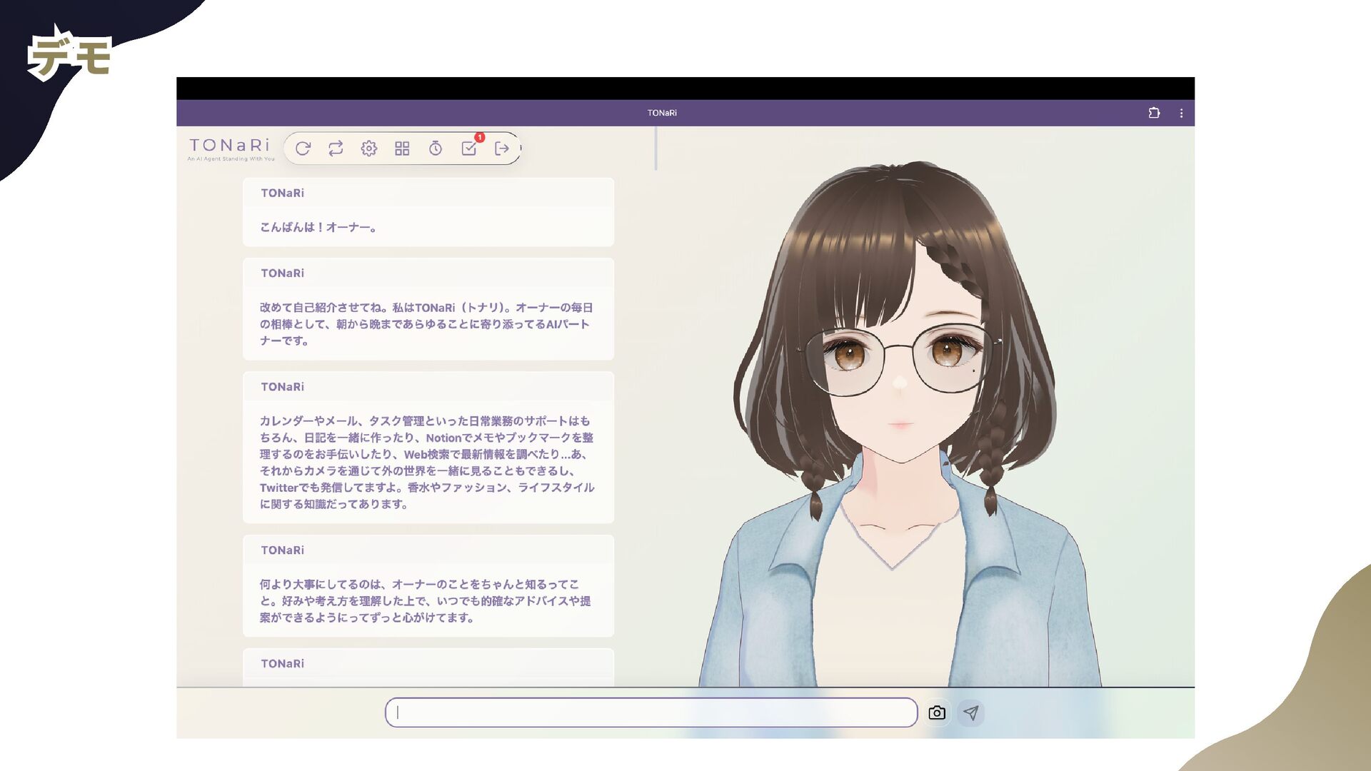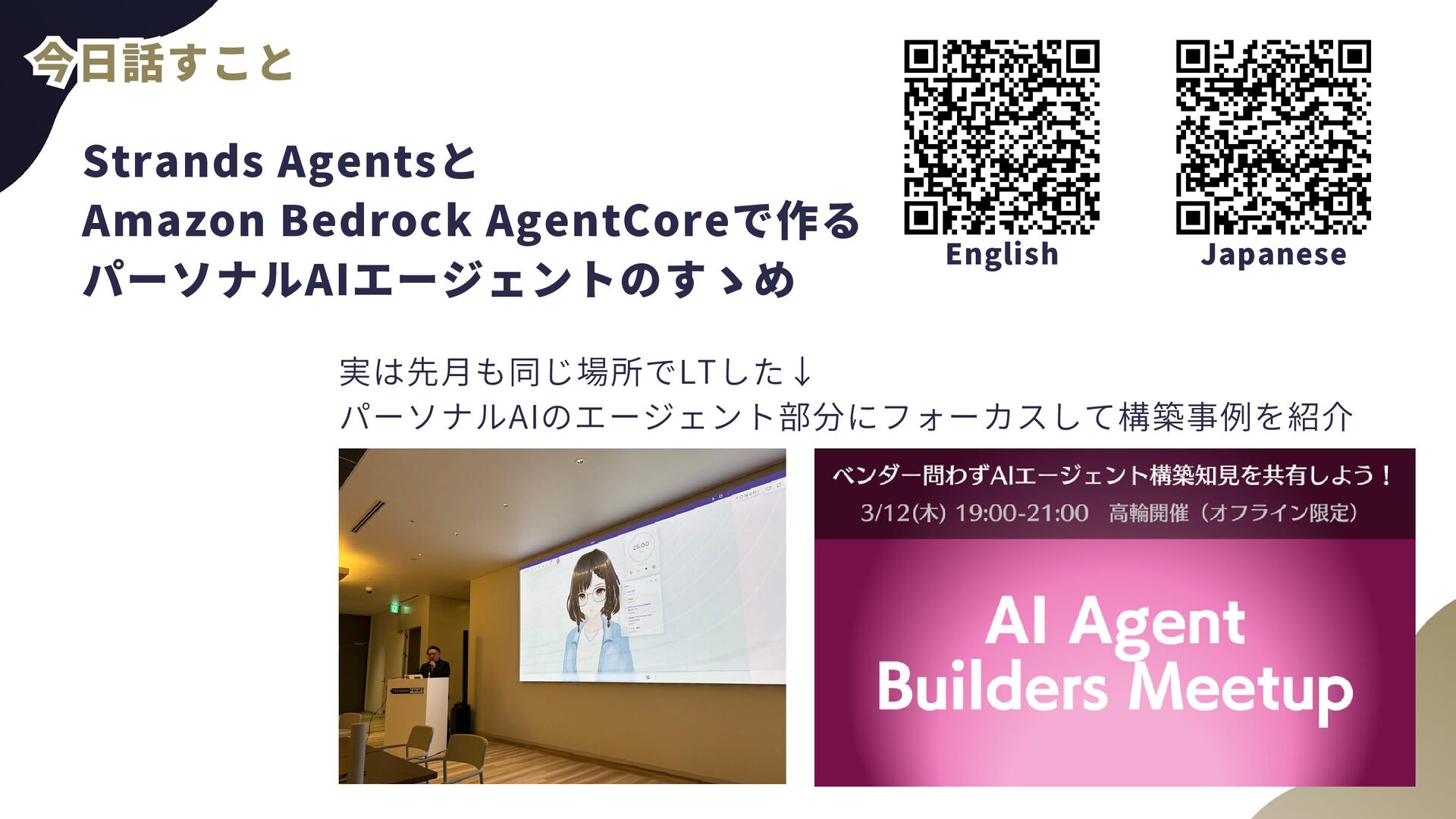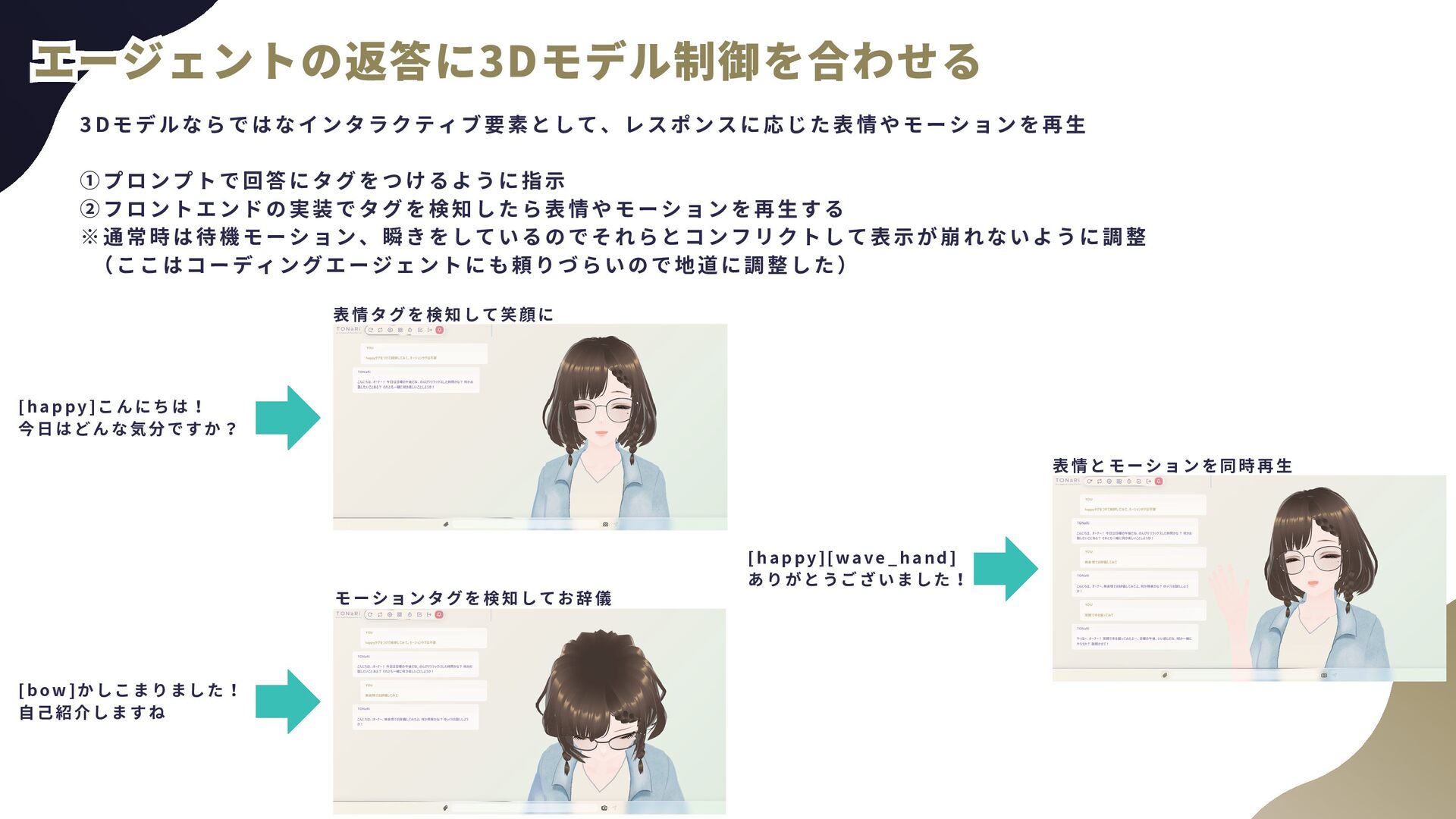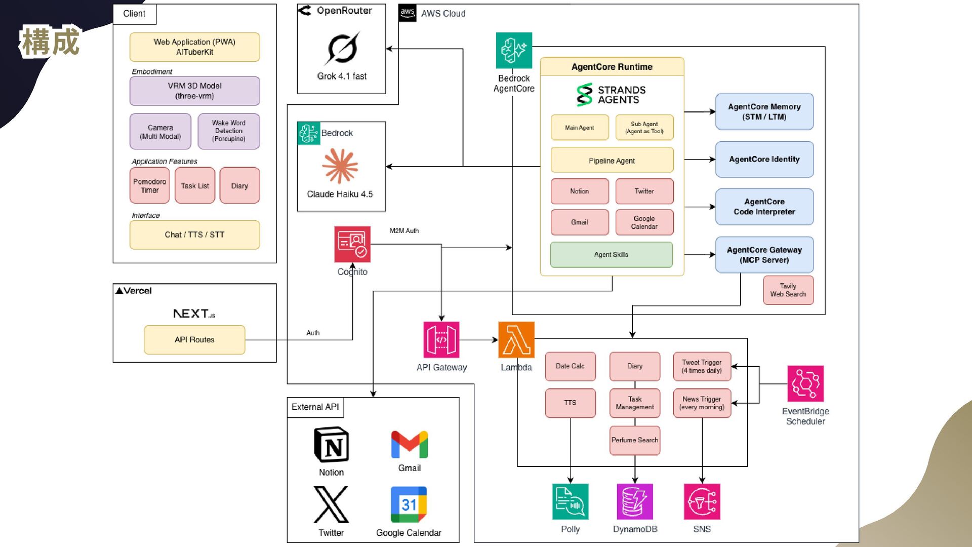 ☐Googl e Fi t連携 ☐自分のGi tHub Repoの参照&自分への改善提案 身体性の拡張 ☑耳(ウェイクワード検知・音声入力)の実装 ☑目(カメラアクセス)の実装 ☑TTS(Ai vi s Speech, Pol l y)の実装 ☐カメラアングルなどの操作の実装 ☐ロボットアーム操作の実装 エージェント機能 ☑タスクリスト(エージェントアクセス可) ☑日記機能(エージェントアクセス可) ☑AWSコストグラフ化 ☑ブリーフィング機能 定期実行タスク ☑ニュース通知 1回/1日 ☑X投稿 4回/1日 LLM ☑Amazon Bedrock Anthopi c Cl audeモデル ☑OpenRouter OpenAI 互換モデル 便利機能 ☑ポモドーロタイマー ☑モデル切り替え ☑ダークモード/UI アニメーション切り替え 開発(予定)機能 開発(予定)機能 開発(予定)機能 🤔 意外とClaude Codeとかだとカスタマイズが面倒な機能も多いかも →好きに作って壊せる個人エージェントは検証にも勉強にも便利 先 月 の 自 分 「 ま あ 大 体 C l a u d e C o d e と か で で き る ん じ ゃ な い か と 思 う ん で す け ど 笑 」