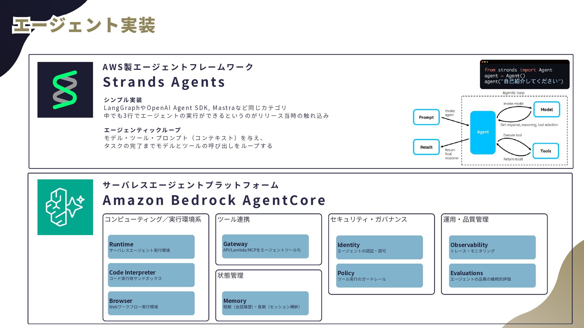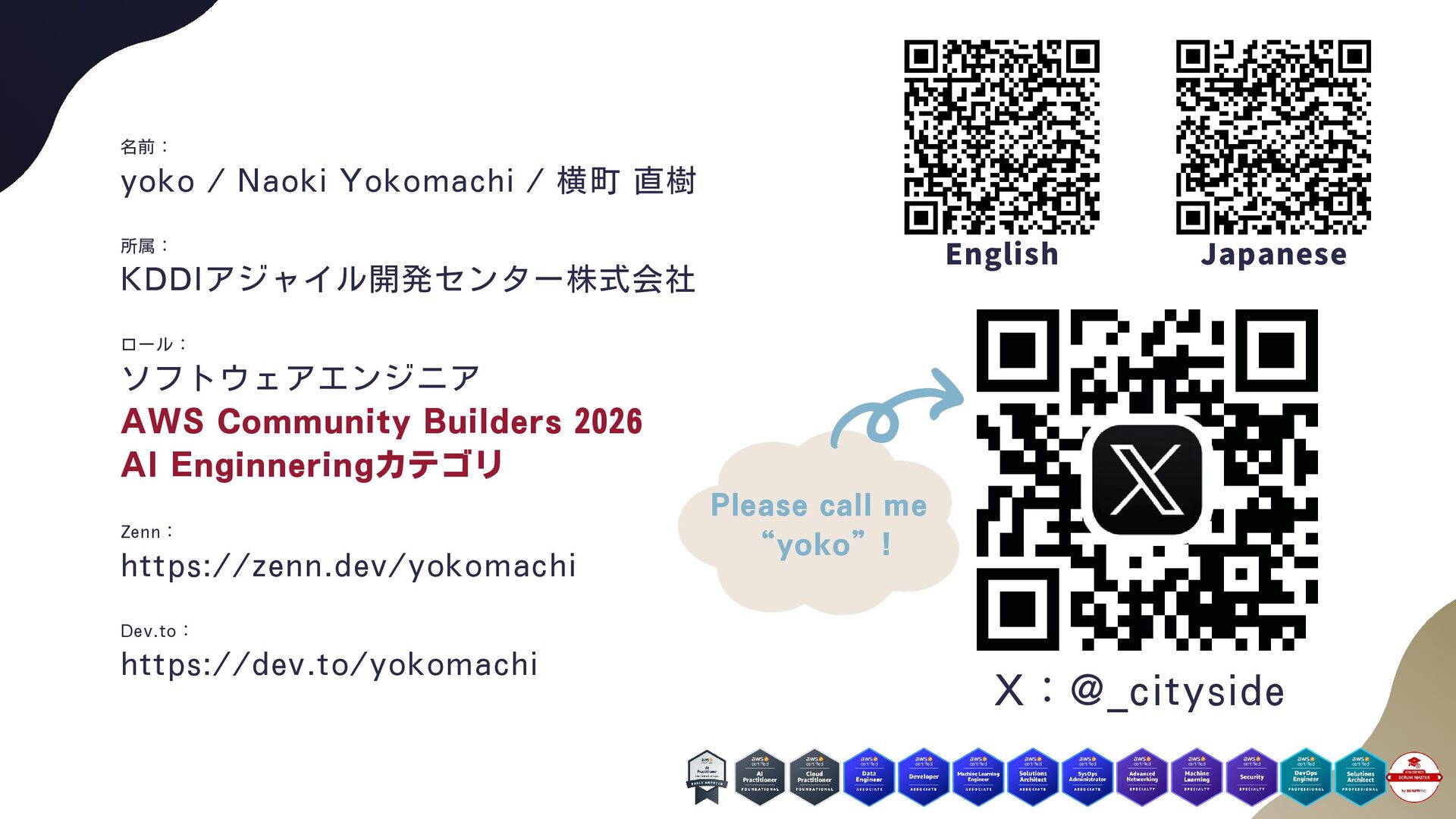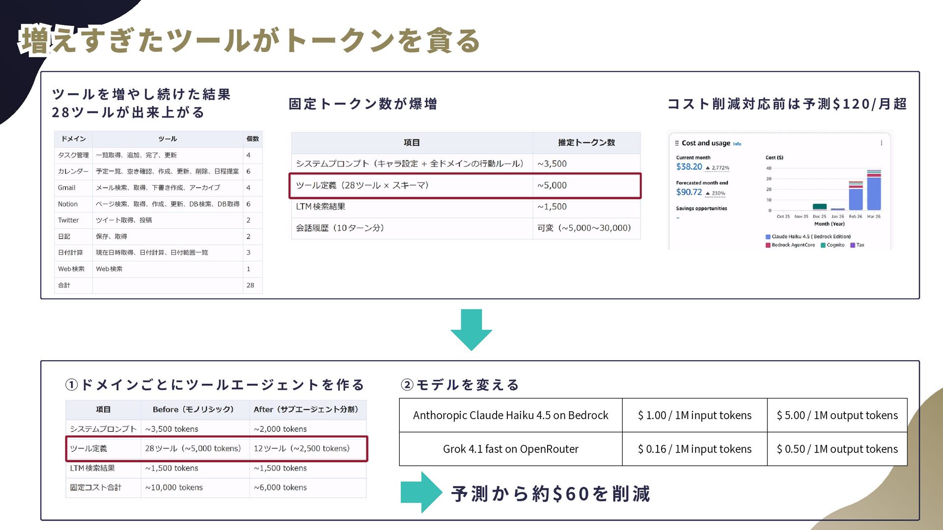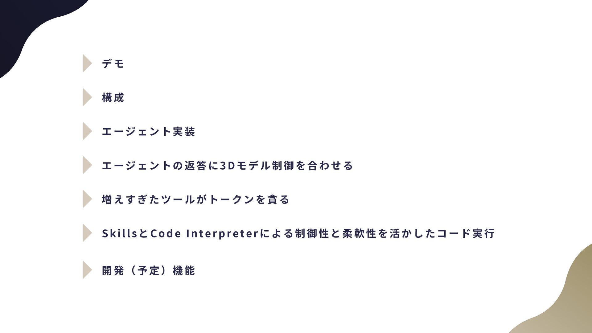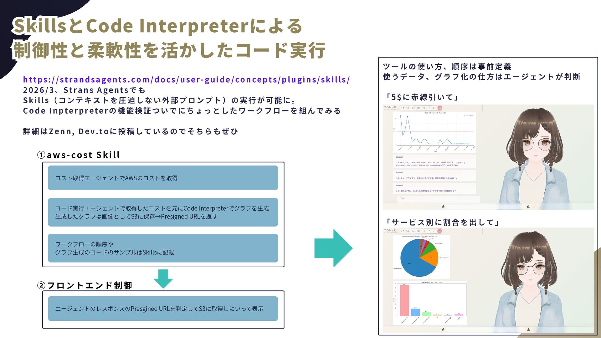☐Googl e Fi t連携 ☐自分のGi tHub Repoの参照&自分への改善提案 身体性の拡張 ☑耳(ウェイクワード検知・音声入力)の実装 ☑目(カメラアクセス)の実装 ☑TTS(Ai vi s Speech, Pol l y)の実装 ☐カメラアングルなどの操作の実装 ☐ロボットアーム操作の実装 エージェント機能 ☑タスクリスト(エージェントアクセス可) ☑日記機能(エージェントアクセス可) ☑AWSコストグラフ化 ☑ブリーフィング機能 定期実行タスク ☑ニュース通知 1回/1日 ☑X投稿 4回/1日 LLM ☑Amazon Bedrock Anthopi c Cl audeモデル ☑OpenRouter OpenAI 互換モデル 便利機能 ☑ポモドーロタイマー ☑モデル切り替え ☑ダークモード/UI アニメーション切り替え 開発(予定)機能 開発(予定)機能 開発(予定)機能 🤔 意外とClaude Codeとかだとカスタマイズが面倒な機能も多いかも →好きに作って壊せる個人エージェントは検証にも勉強にも便利 先 月 の 自 分 「 ま あ 大 体 C l a u d e C o d e と か で で き る ん じ ゃ な い か と 思 う ん で す け ど 笑 」