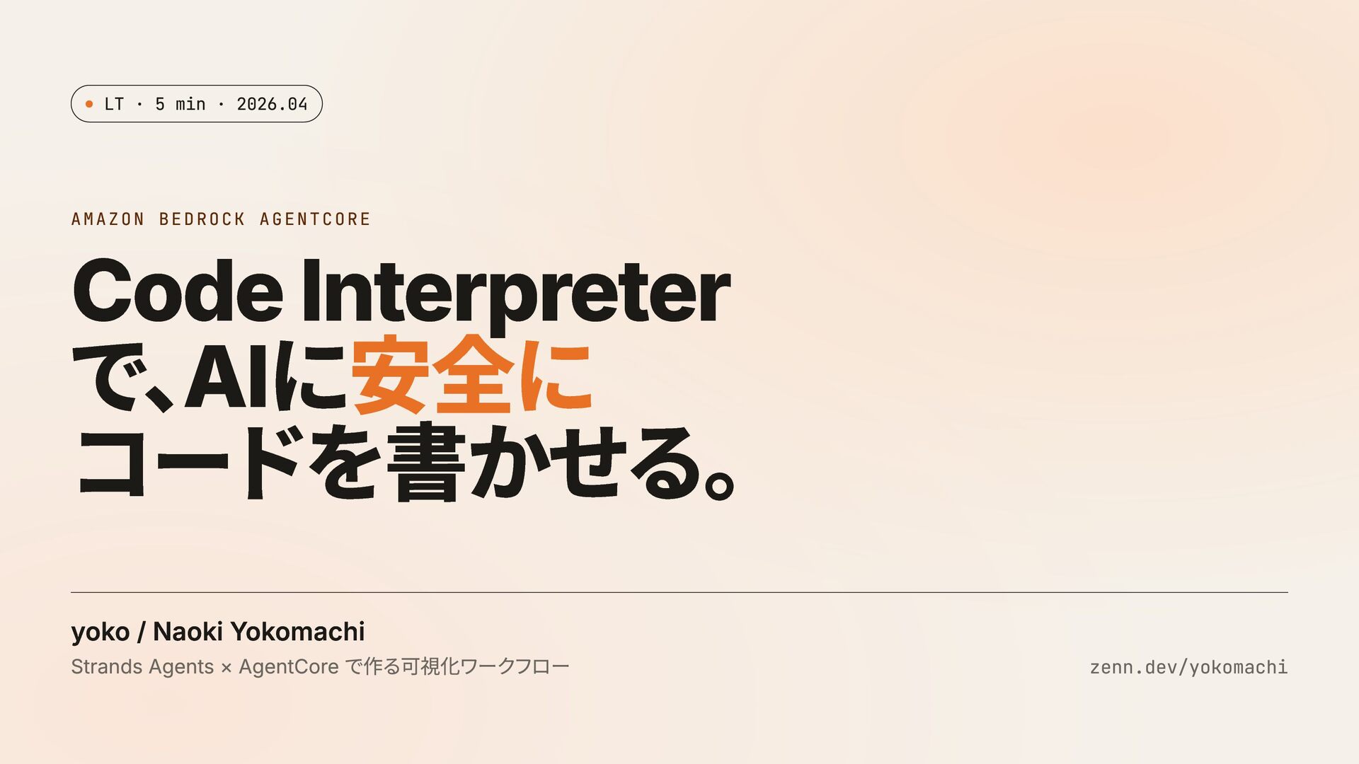 Interpreter で、 AIに安全に コードを書かせる。 yoko / Naoki Yokomachi Strands Agents × AgentCore で作る可視化ワークフロー zenn.dev/yokomachi