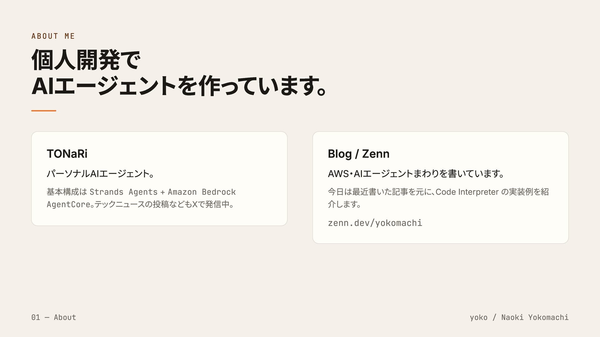 Amazon Bedrock AgentCore。 テックニュースの投稿などもXで発信中。 Blog / Zenn AWS・AIエージェントまわりを書いています。 今日は最近書いた記事を元に、 Code Interpreter の実装例を紹 介します。 zenn.dev/yokomachi 01 — About yoko / Naoki Yokomachi