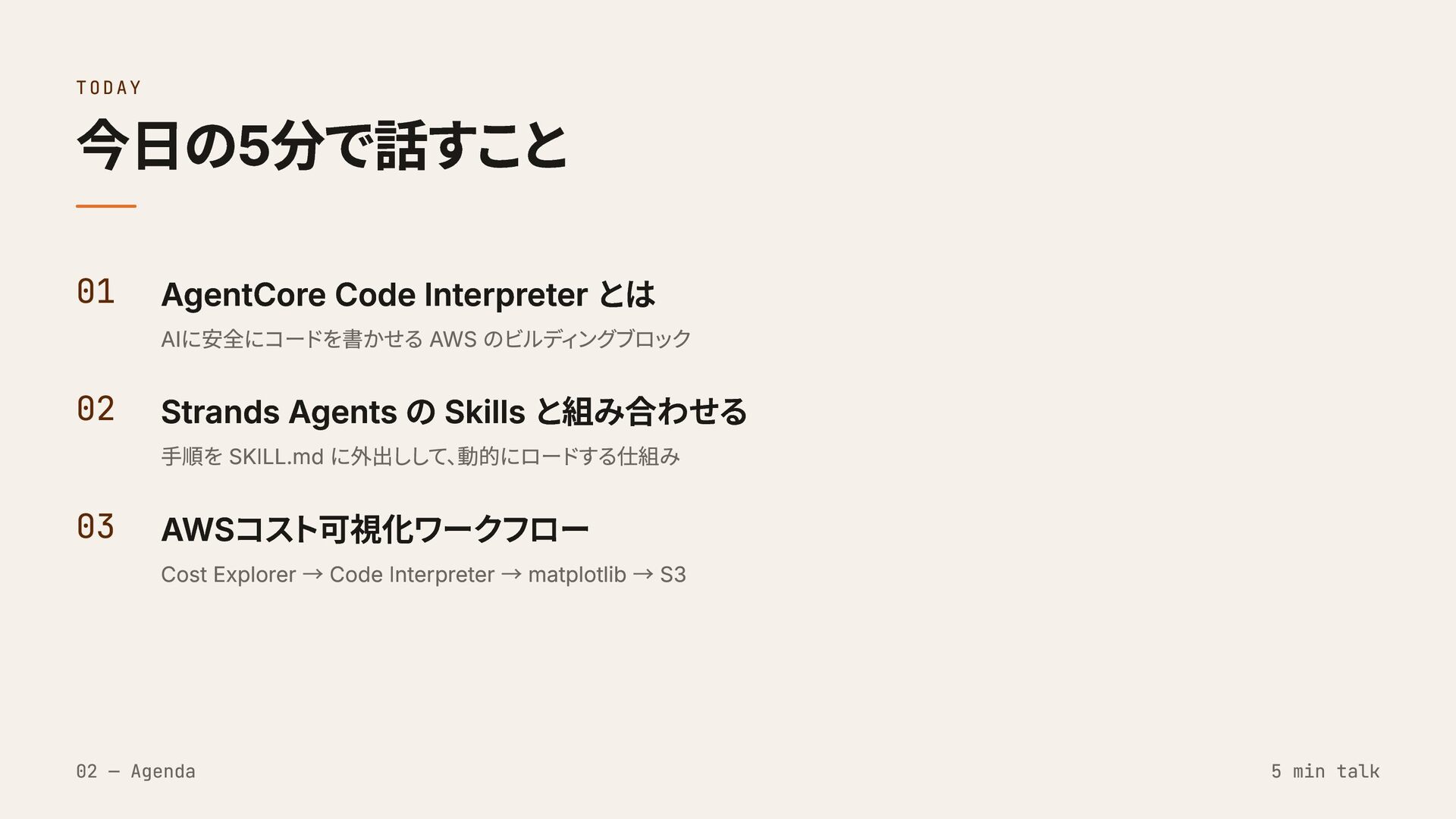 02 Strands Agents の Skills と組み合わせる 手順を SKILL.md に外出しして、 動的にロードする仕組み 03 AWSコスト可視化ワークフロー Cost Explorer → Code Interpreter → matplotlib → S3 02 — Agenda 5 min talk