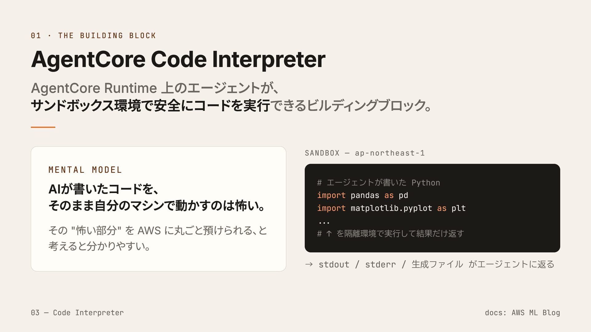 上のエージェントが、 サンドボックス環境で安全にコードを実行できるビルディングブロック。 MENTAL MODEL AIが書いたコードを、 そのまま自分のマシンで動かすのは怖い。 その "怖い部分" を AWS に丸ごと預けられる、 と 考えると分かりやすい。 SANDBOX — ap-northeast-1 # エージェントが書いた Python import pandas as pd import matplotlib.pyplot as plt ... # ↑ を隔離環境で実行して結果だけ返す → stdout / stderr / 生成ファイル がエージェントに返る 03 — Code Interpreter docs: AWS ML Blog