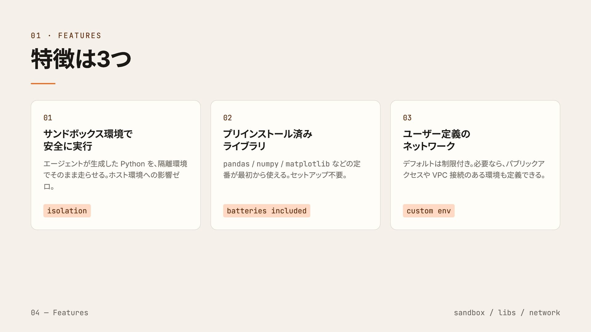 隔離環境 でそのまま走らせる。 ホスト環境への影響ゼ ロ。 isolation 02 プリインストール済み ライブラリ pandas / numpy / matplotlib などの定 番が最初から使える。 セットアップ不要。 batteries included 03 ユーザー定義の ネットワーク デフォルトは制限付き。 必要なら、 パブリックア クセスや VPC 接続のある環境も定義できる。 custom env 04 — Features sandbox / libs / network
