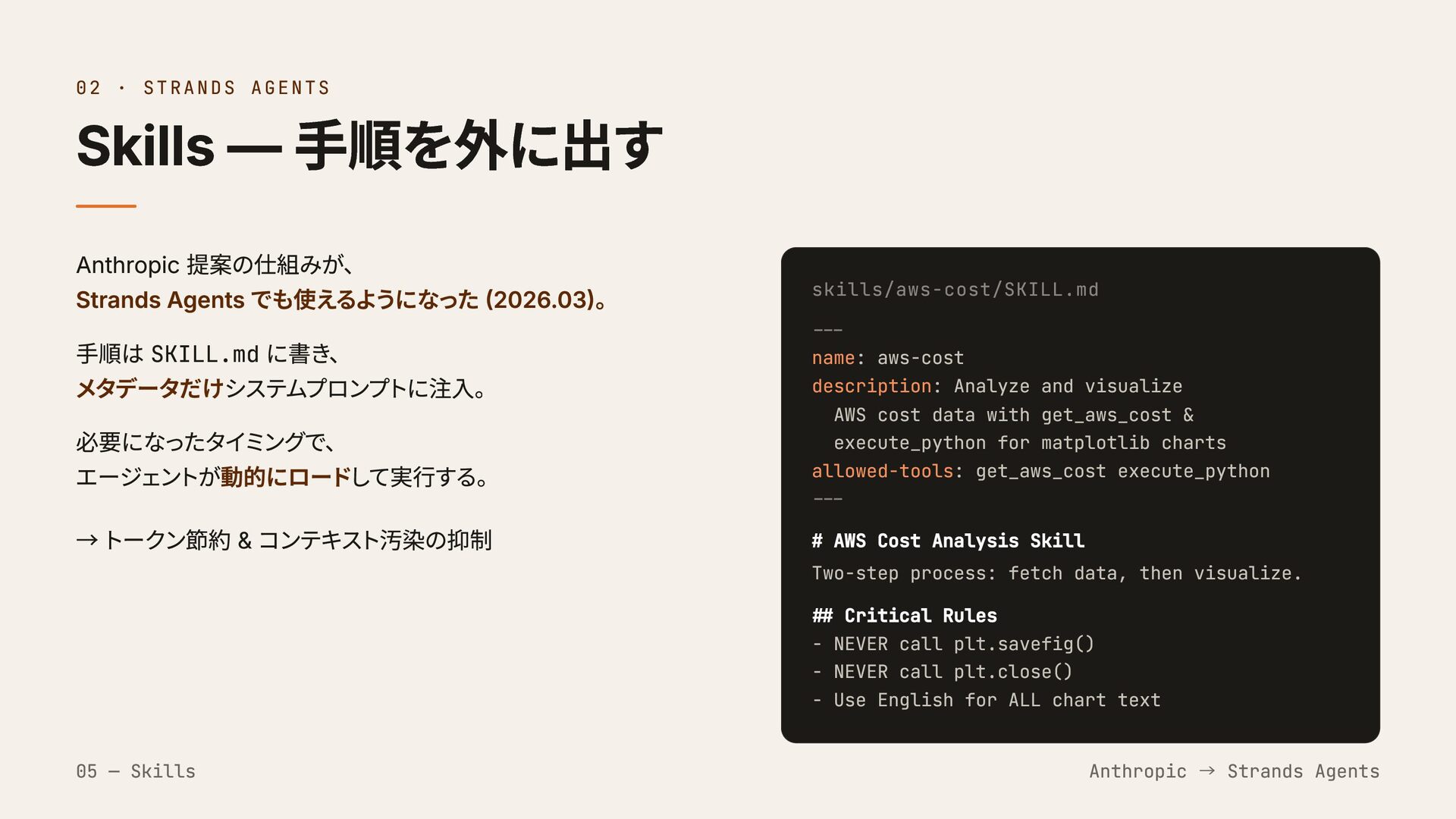 Agents でも使えるようになった (2026.03)。 手順は SKILL.md に書き、 メタデータだけシステムプロンプトに注入。 必要になったタイミングで、 エージェントが動的にロードして実行する。 → トークン節約 & コンテキスト汚染の抑制 skills/aws-cost/SKILL.md --- name: aws-cost description: Analyze and visualize AWS cost data with get_aws_cost & execute_python for matplotlib charts allowed-tools: get_aws_cost execute_python --- # AWS Cost Analysis Skill Two-step process: fetch data, then visualize. ## Critical Rules - NEVER call plt.savefig() - NEVER call plt.close() - Use English for ALL chart text 05 — Skills Anthropic → Strands Agents