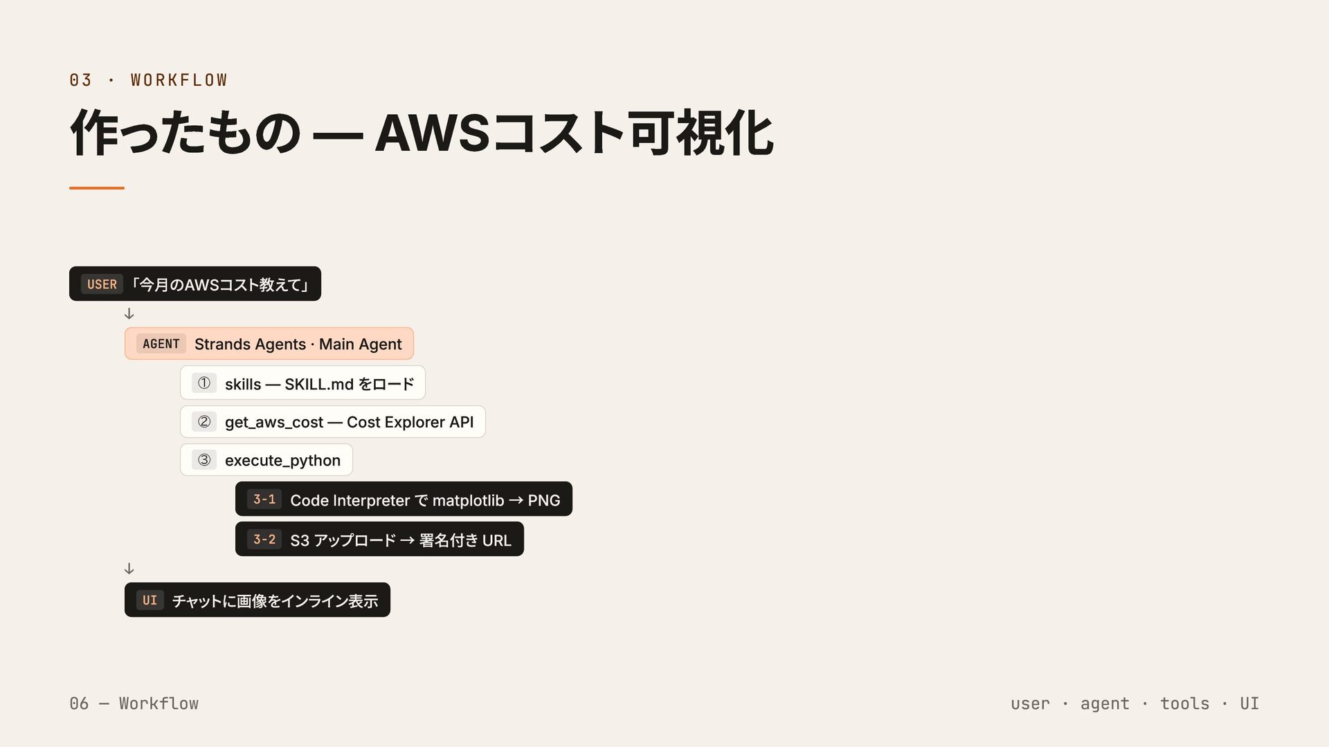 Strands Agents · Main Agent ① skills — SKILL.md をロード ② get_aws_cost — Cost Explorer API ③ execute_python 3-1 Code Interpreter で matplotlib → PNG 3-2 S3 アップロード → 署名付き URL ↓ UI チャットに画像をインライン表示 06 — Workflow user · agent · tools · UI