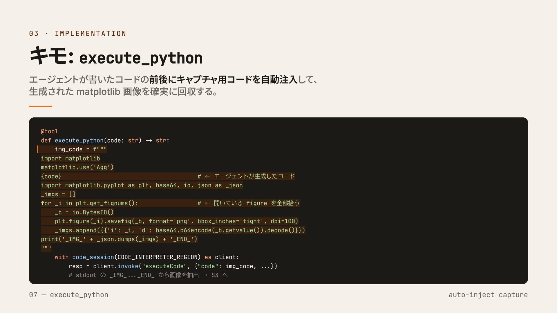 def execute_python(code: str) -> str: img_code = f""" import matplotlib matplotlib.use('Agg') {code} # ← エージェントが生成したコード import matplotlib.pyplot as plt, base64, io, json as _json _imgs = [] for _i in plt.get_fignums(): # ← 開いている figure を全部拾う _b = io.BytesIO() plt.figure(_i).savefig(_b, format='png', bbox_inches='tight', dpi=100) _imgs.append({{'i': _i, 'd': base64.b64encode(_b.getvalue()).decode()}}) print('_IMG_' + _json.dumps(_imgs) + '_END_') """ with code_session(CODE_INTERPRETER_REGION) as client: resp = client.invoke("executeCode", {"code": img_code, ...}) # stdout の _IMG_..._END_ から画像を抽出 → S3 へ 07 — execute_python auto-inject capture