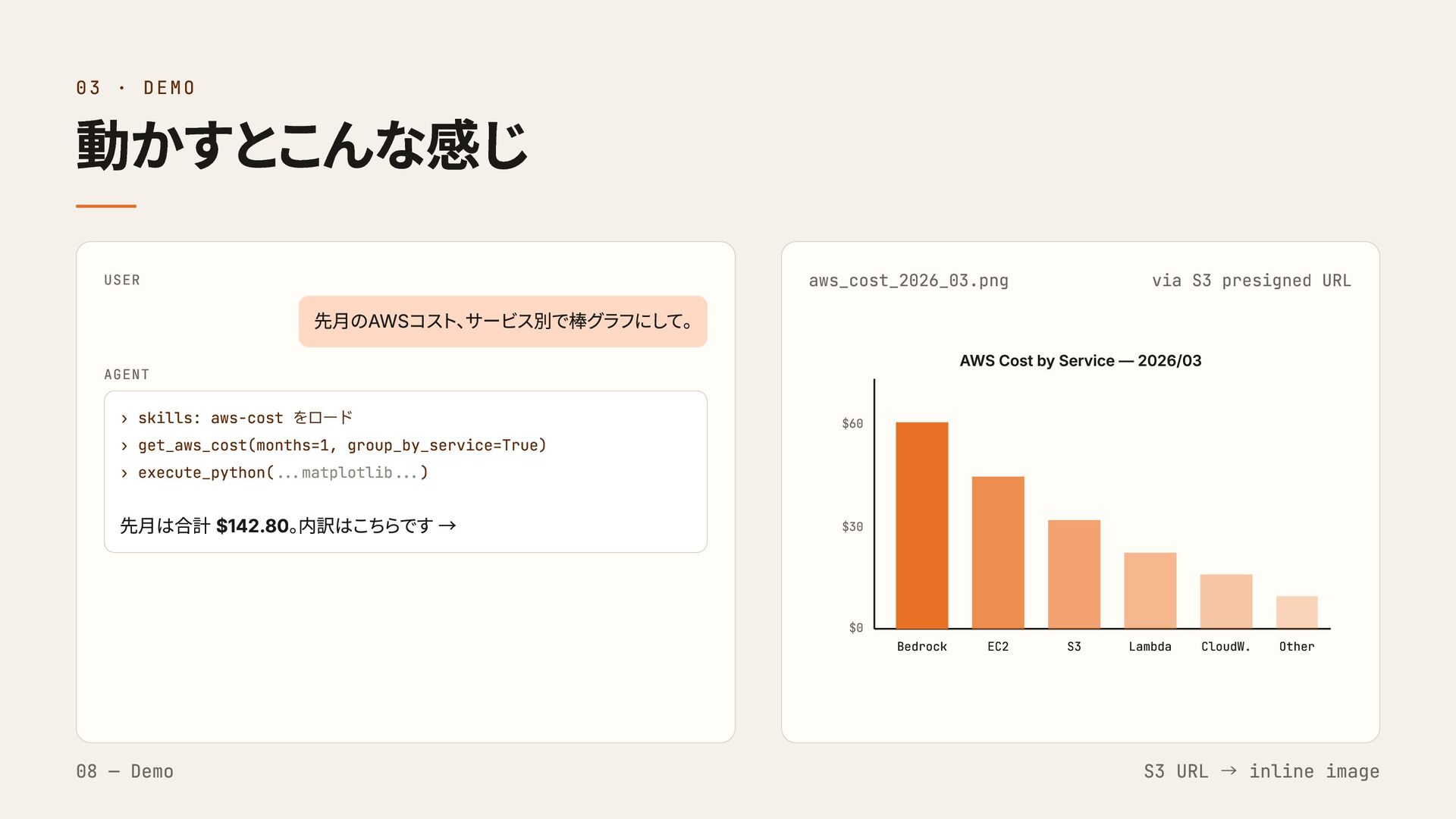aws-cost をロード › get_aws_cost(months=1, group_by_service=True) › execute_python(...matplotlib...) 先月は合計 $142.80。 内訳はこちらです → aws_cost_2026_03.png via S3 presigned URL $60 $30 $0 Bedrock EC2 S3 Lambda CloudW. Other AWS Cost by Service — 2026/03 08 — Demo S3 URL → inline image