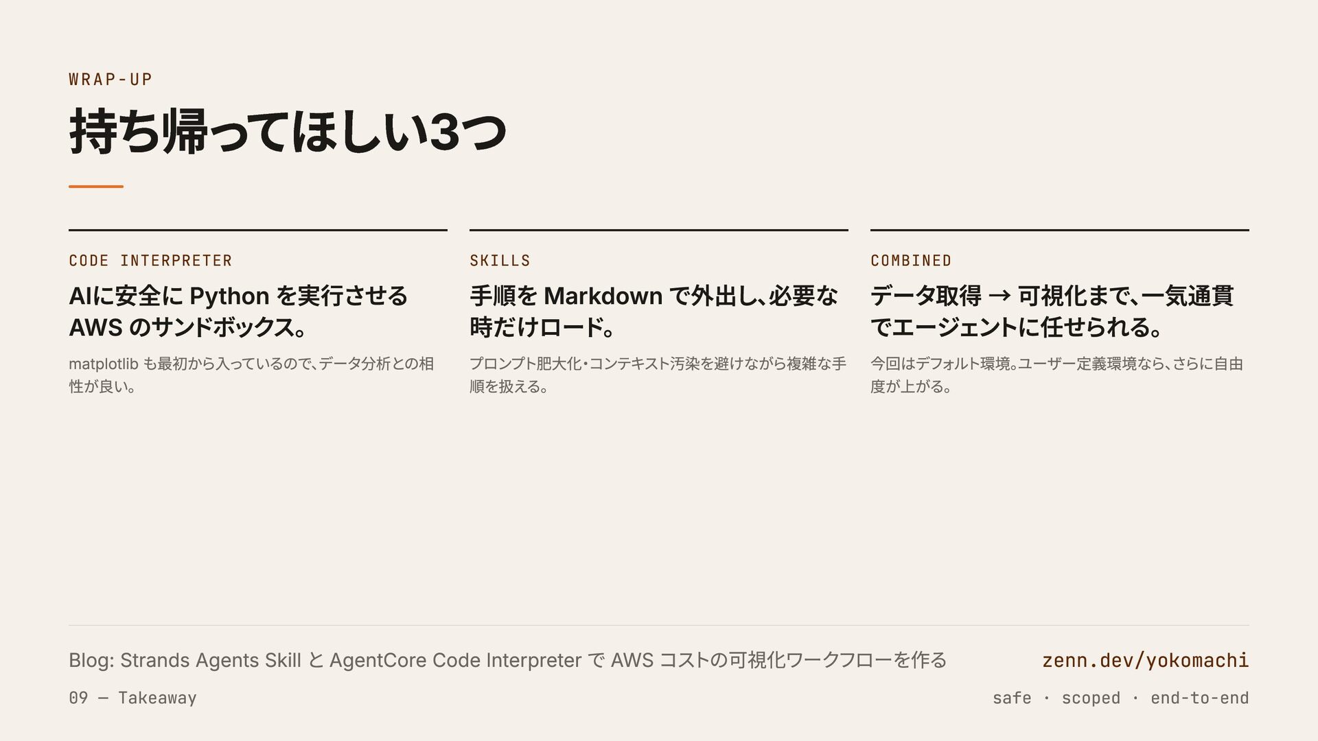 も最初から入っているので、 データ分析との相 性が良い。 SKILLS 手順を Markdown で外出し、 必要な 時だけロード。 プロンプト肥大化・コンテキスト汚染を避けながら複雑な手 順を扱える。 COMBINED データ取得 → 可視化まで、 一気通貫 でエージェントに任せられる。 今回はデフォルト環境。 ユーザー定義環境なら、 さらに自由 度が上がる。 Blog: Strands Agents Skill と AgentCore Code Interpreter で AWS コストの可視化ワークフローを作る zenn.dev/yokomachi 09 — Takeaway safe · scoped · end-to-end