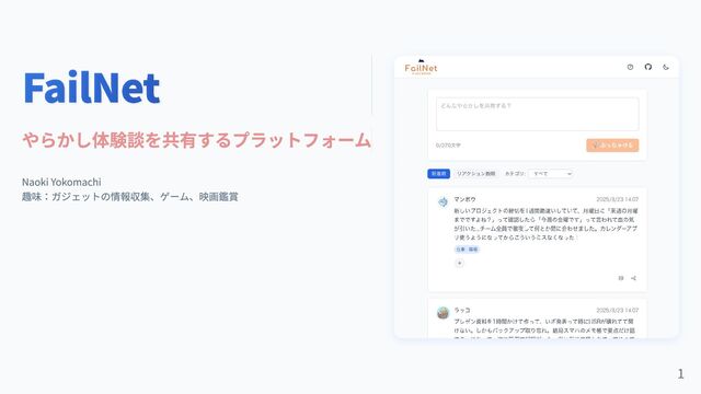FailNet やらかし体験談を共有するプラットフォーム FailNet Naoki Yokomachi 趣味:ガジェットの情報収集、ゲーム、映画鑑賞 1