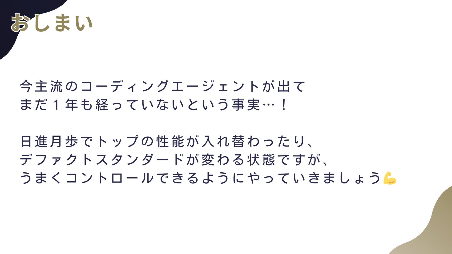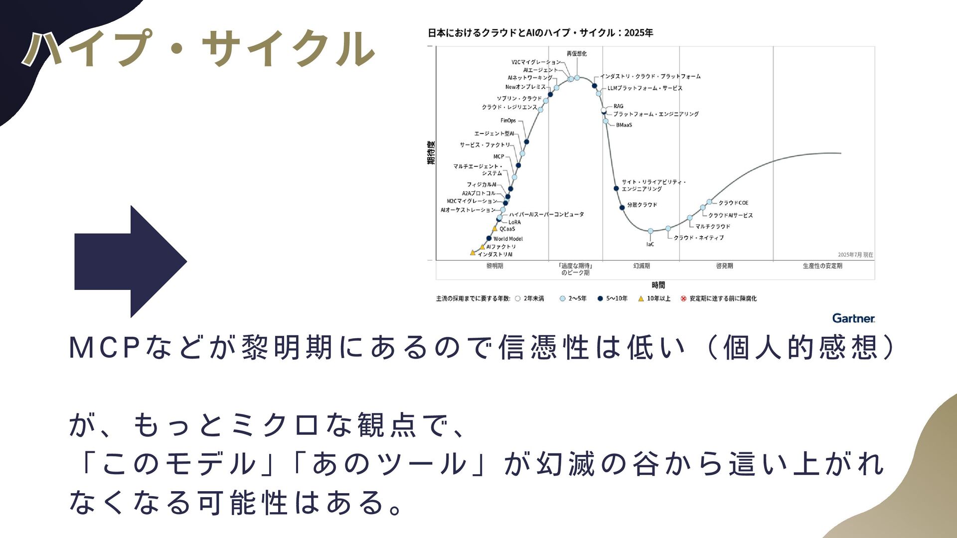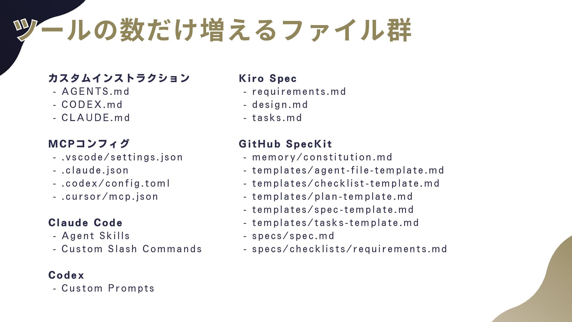 Windsurf V0, Bolt.new, Lovable MCP: GitHub, AWS Documentation, Serena, PlayWright, Context7, Atlassain LLM App: Claude, ChatGPT, Gemini, NotebookLLM, Perplexty, Consensus エージェントフレームワーク: LangGraph, Mastra, Strands Agents インフラ: AWS Bedrock, Bedrock AgentCore Zennも書いています