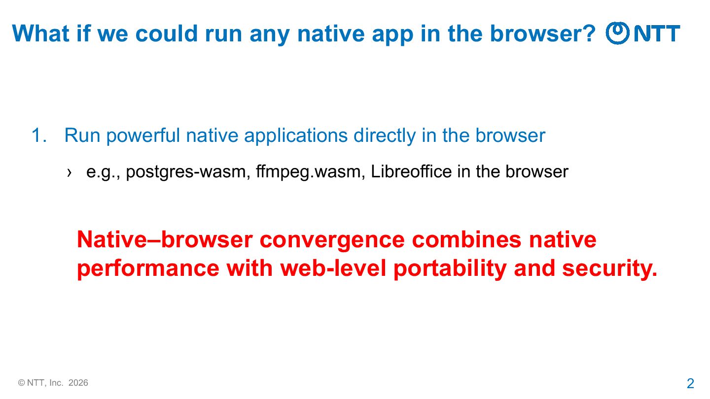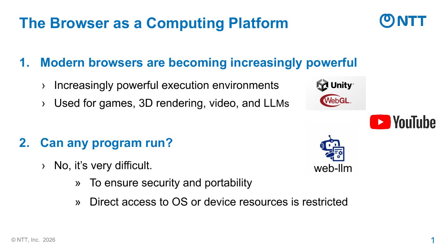 increasingly powerful › Increasingly powerful execution environments › Used for games, 3D rendering, video, and LLMs 2. Can any program run? › No, it’s very difficult. » To ensure security and portability » Direct access to OS or device resources is restricted The Browser as a Computing Platform web-llm