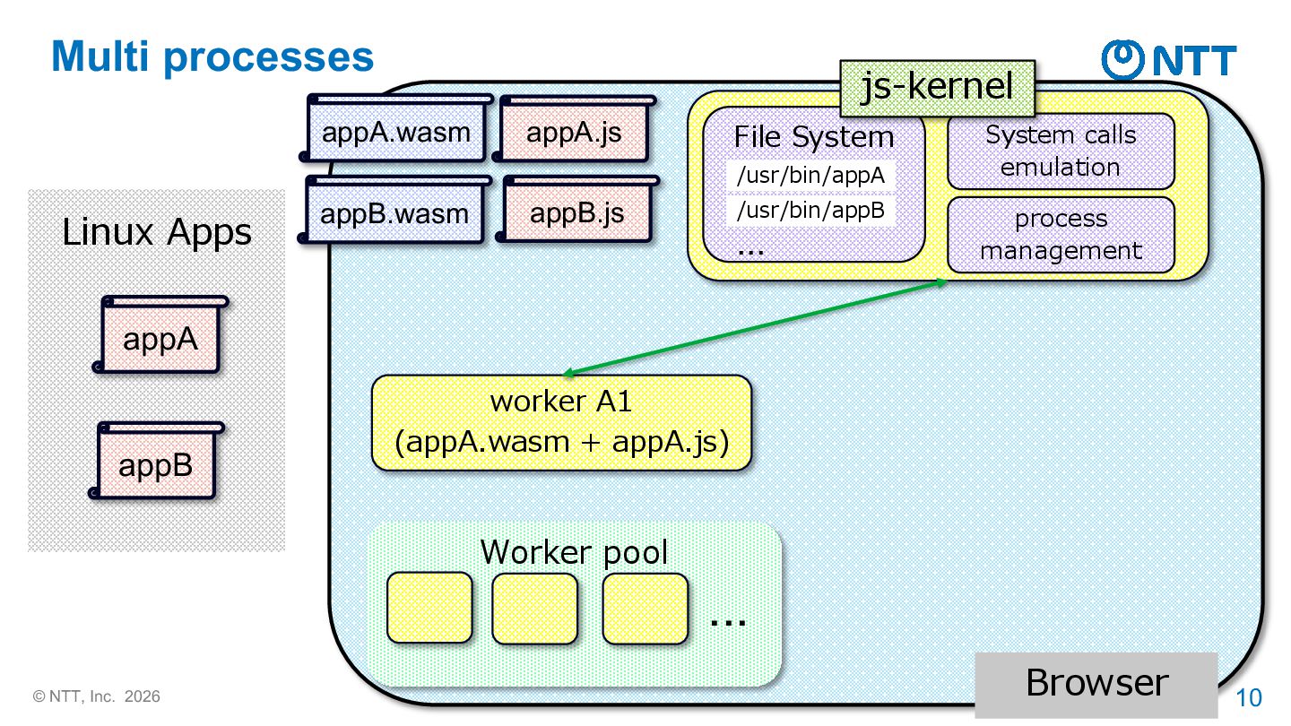 (appA.wasm + appA.js) Worker pool ... Browser Linux Apps appA appB appA.js appB.wasm appB.js File System /usr/bin/appA /usr/bin/appB ... System calls emulation process management js-kernel
