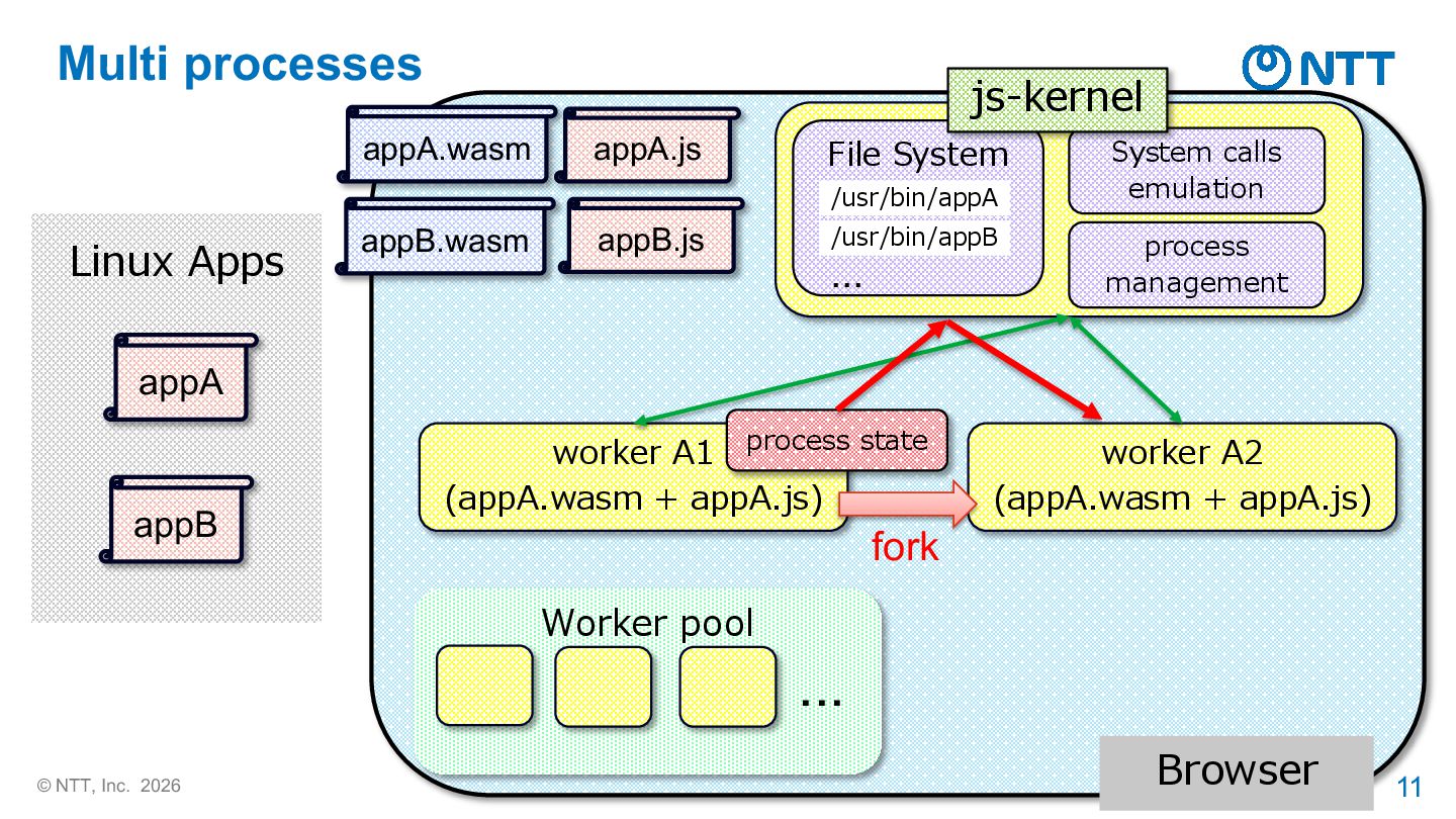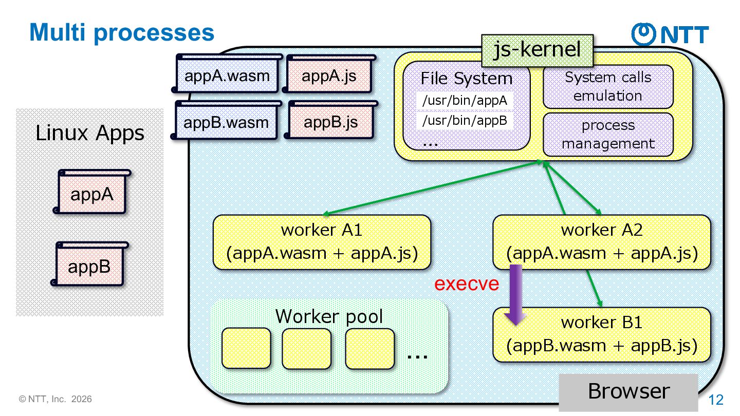 (appA.wasm + appA.js) Worker pool ... Browser Linux Apps appA appB appA.js appB.wasm appB.js File System /usr/bin/appA /usr/bin/appB ... System calls emulation process management js-kernel worker A2 (appA.wasm + appA.js) process state fork