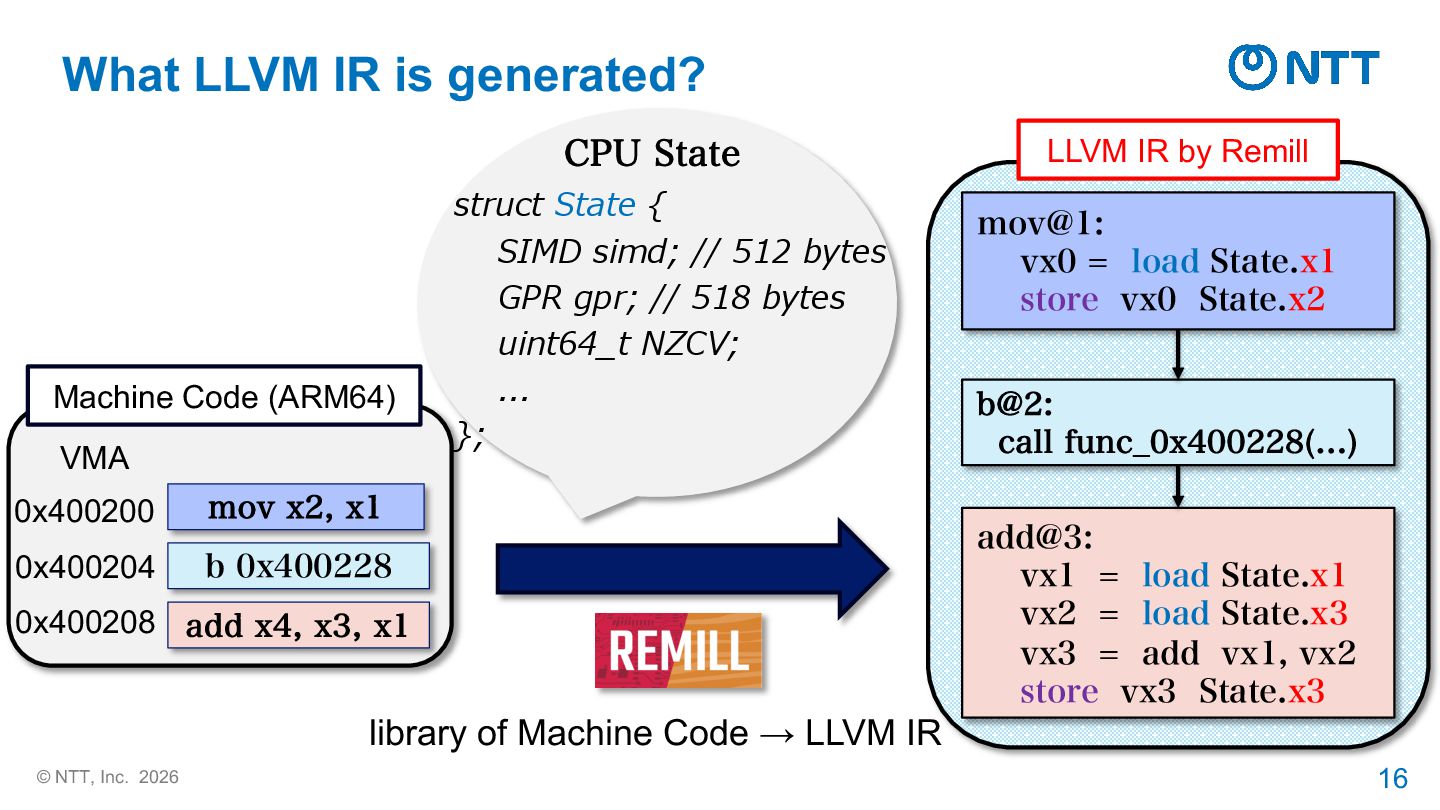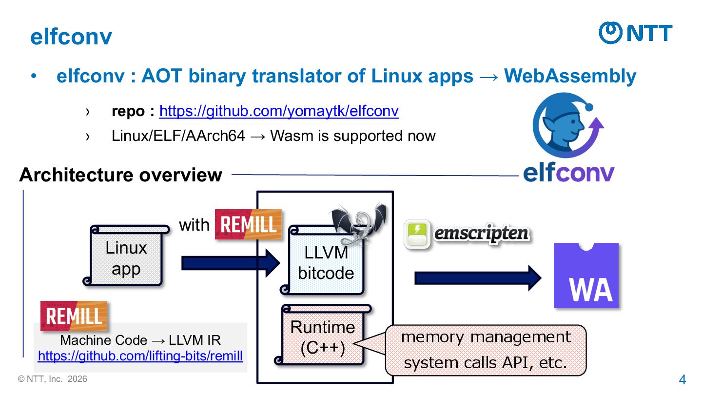 https://github.com/lifting-bits/remill • elfconv : AOT binary translator of Linux apps → WebAssembly › repo : https://github.com/yomaytk/elfconv › Linux/ELF/AArch64 → Wasm is supported now elfconv Linux app LLVM bitcode Architecture overview Runtime (C++) memory management system calls API, etc. with