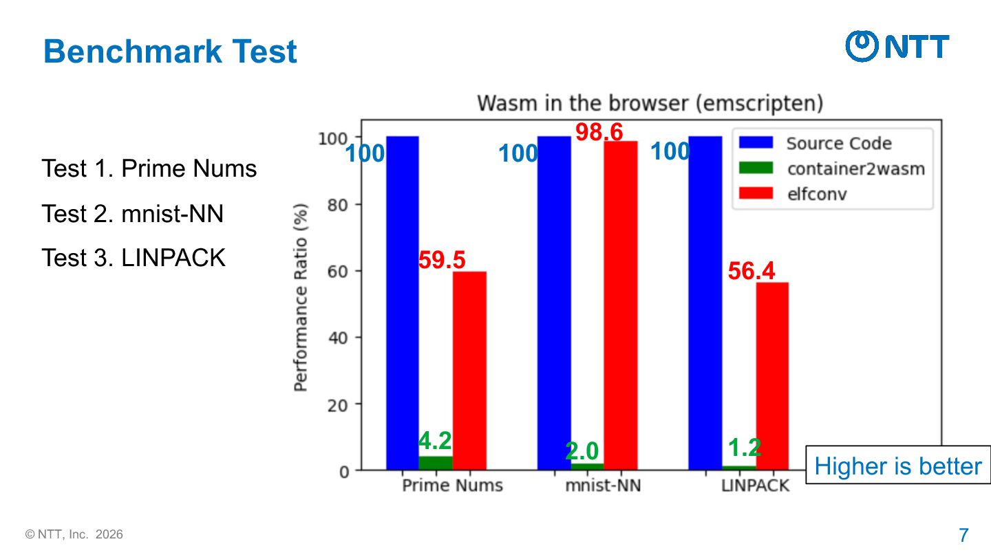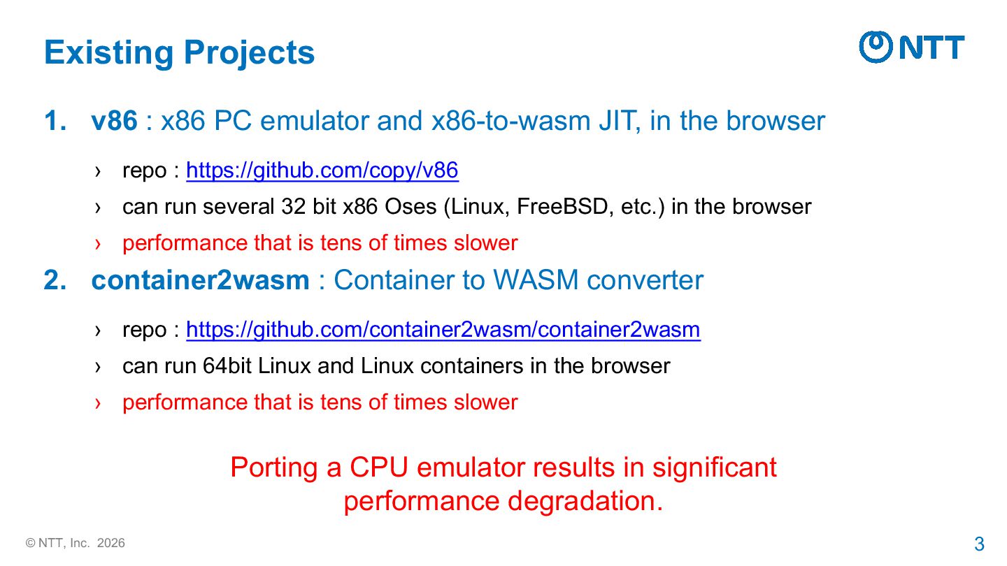 emulator and x86-to-wasm JIT, in the browser › repo : https://github.com/copy/v86 › can run several 32 bit x86 Oses (Linux, FreeBSD, etc.) in the browser › performance that is tens of times slower 2. container2wasm : Container to WASM converter › repo : https://github.com/container2wasm/container2wasm › can run 64bit Linux and Linux containers in the browser › performance that is tens of times slower Existing Projects Porting a CPU emulator results in significant performance degradation.