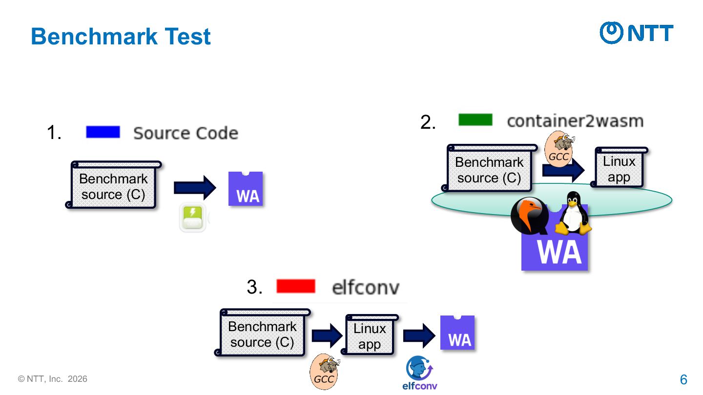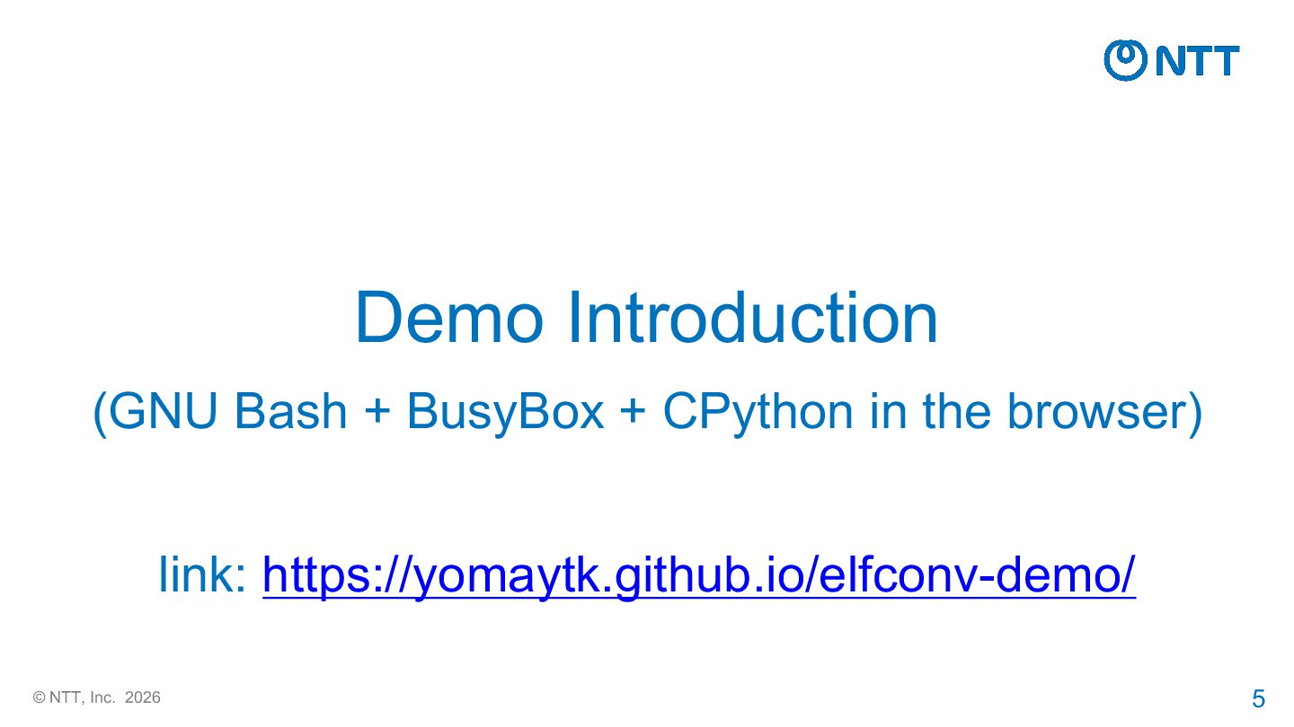 additional Linux syscall emulation › convert the Linux shared objects (.so) » only statically linked ELF binary is supported now › additional machine code conversion (especially x86-64) 1. Porting more tools › enhance python environment, porting CRuby, ... › Do you have any ideas? 😀 Future Work Any issues or PRs are welcome! Repo: https://github.com/yomaytk/elfconv