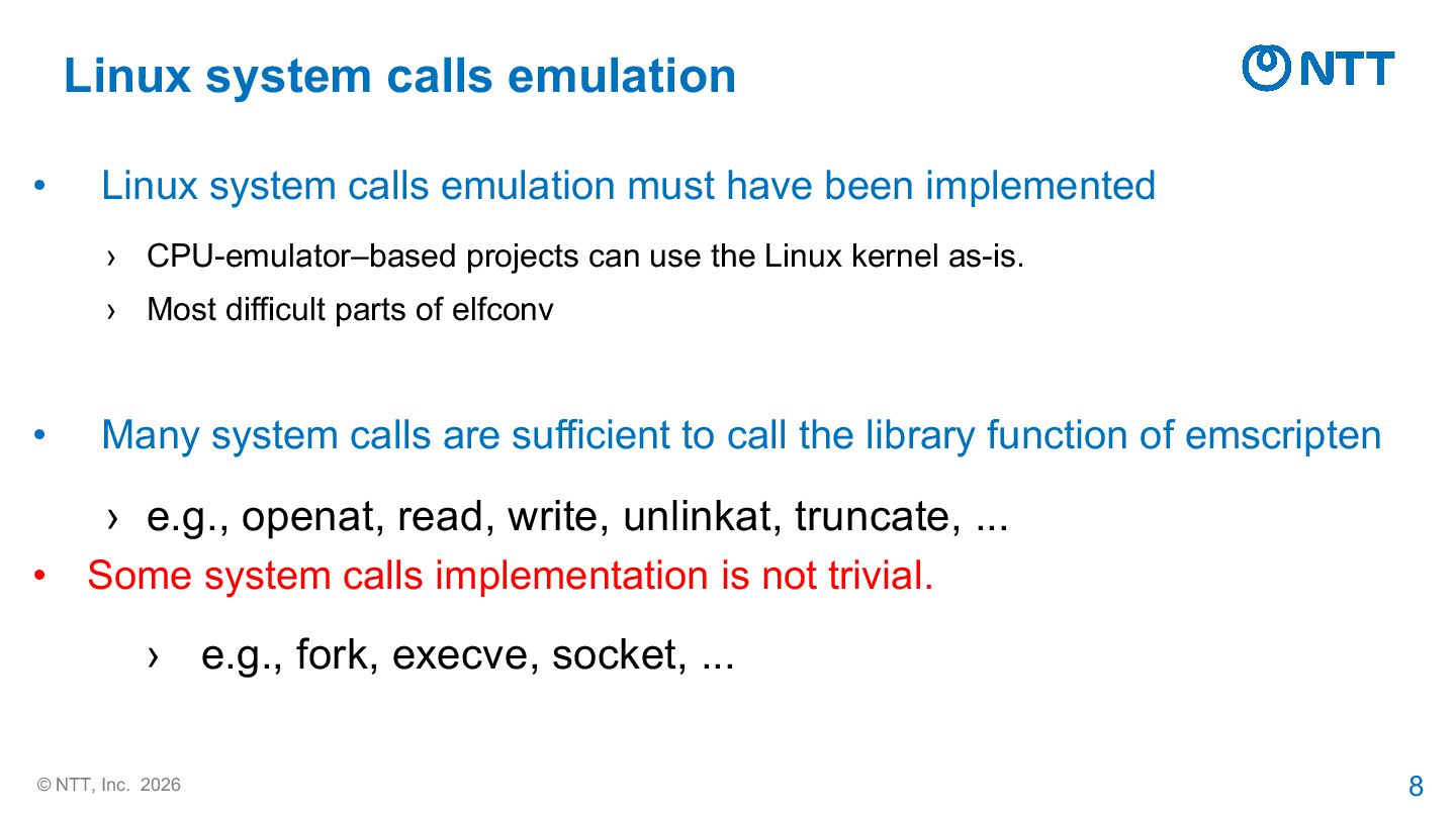must have been implemented › CPU-emulator–based projects can use the Linux kernel as-is. › Most difficult parts of elfconv • Many system calls are sufficient to call the library function of emscripten › e.g., openat, read, write, unlinkat, truncate, ... • Some system calls implementation is not trivial. › e.g., fork, execve, socket, ... Linux system calls emulation