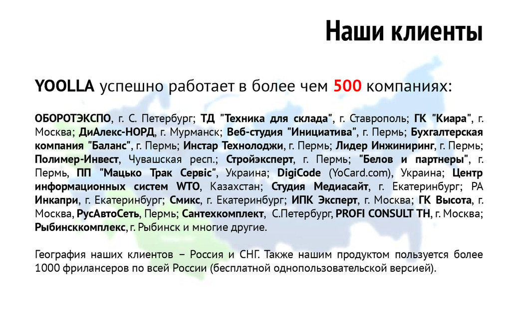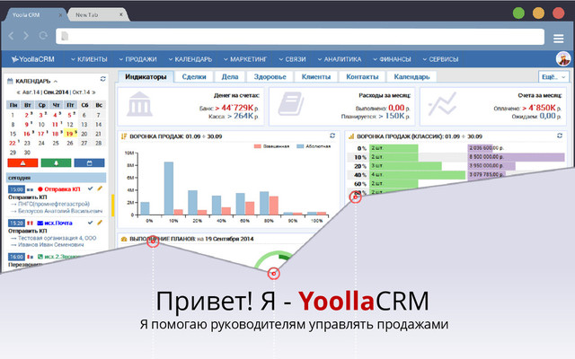 Yoolla - это веб-приложение класса CRM, которое позволяет организовать эффективную работу отдела продаж без дополнительных затрат на внедрение, управлять базой клиентов, вести учет продаж (в т.ч. создавать документы, выставлять счета, акты), контролировать оплаты и анализировать продажи.