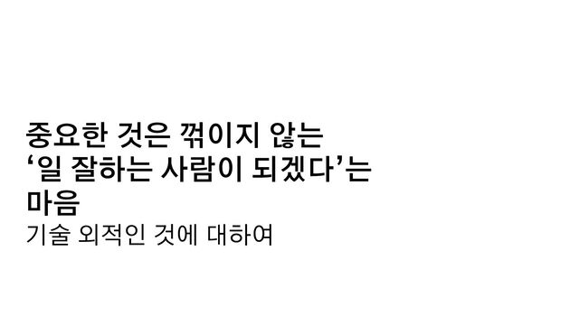 인정받지 못한다. • 각자의 ‘함께 일하고 싶은 사람’을 떠올리면 어떤 모습일까? 그 사람들은 ‘일 잘하는 사람’일 것이다. • ‘개발만 잘하는 사람’이 ‘일 잘하는 사람’이 될 순 없다. 기술 외적인 것도 잘하면 ‘일 잘하는 사람’이 된다. • 각자가 일 잘 하는 사람이 되고, 모두가 일 잘하는 사람이 될 수 있도록 영향을 주자.
