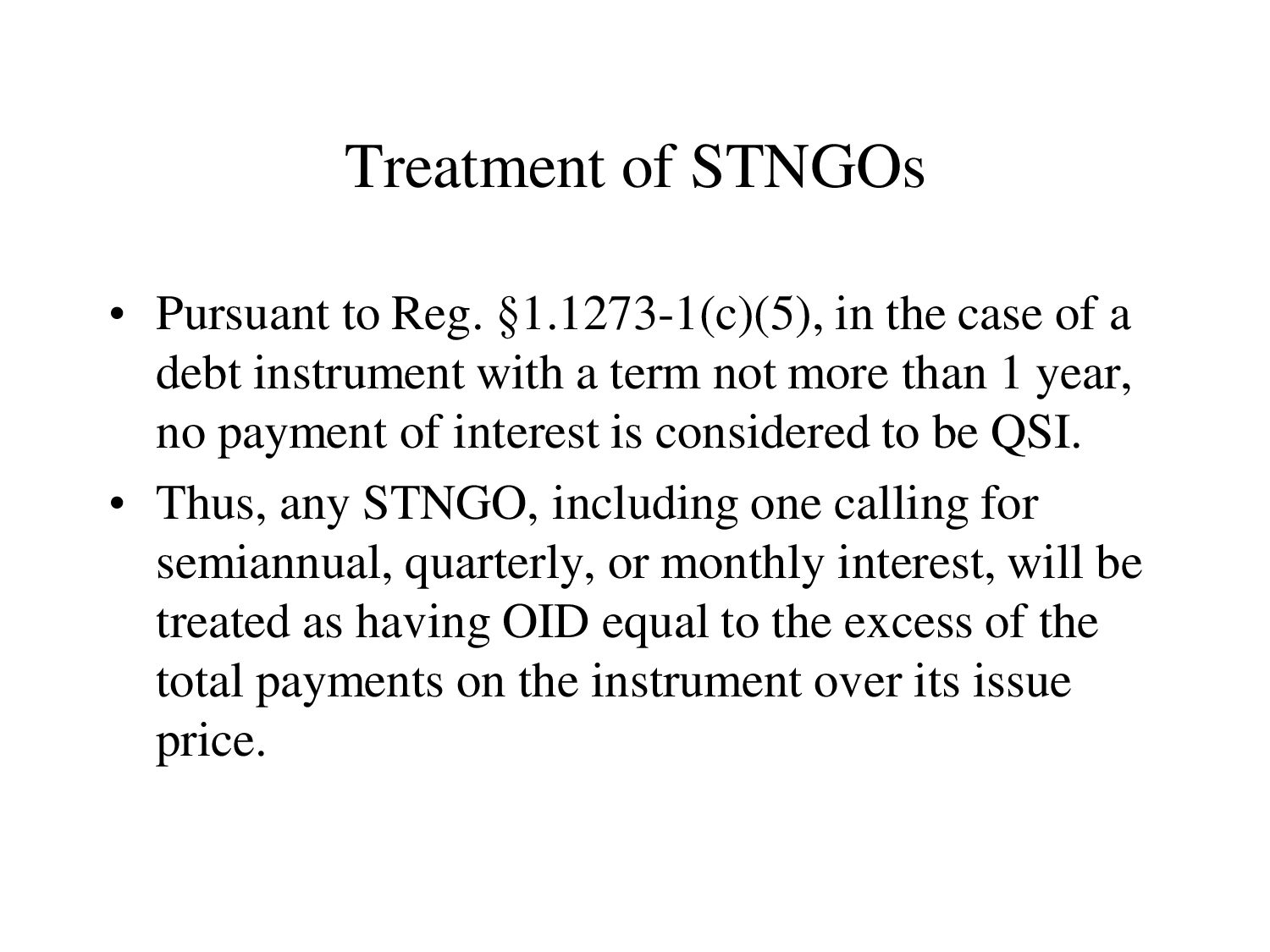 case of a debt instrument with a term not more than 1 year, no payment of interest is considered to be QSI. • Thus, any STNGO, including one calling for semiannual, quarterly, or monthly interest, will be treated as having OID equal to the excess of the total payments on the instrument over its issue price.