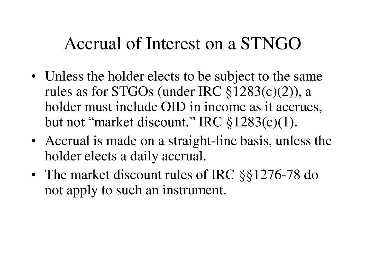 elects to be subject to the same rules as for STGOs (under IRC §1283(c)(2)), a holder must include OID in income as it accrues, but not “market discount.” IRC §1283(c)(1). • Accrual is made on a straight-line basis, unless the holder elects a daily accrual. • The market discount rules of IRC §§1276-78 do not apply to such an instrument.