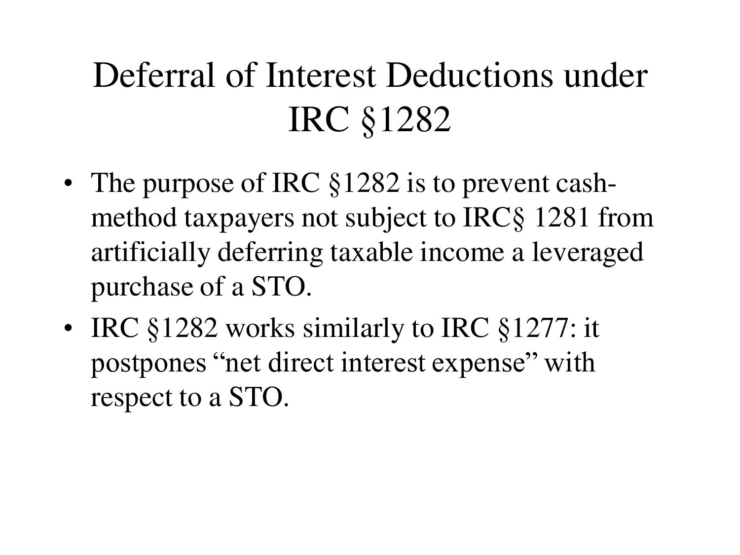 of IRC §1282 is to prevent cash- method taxpayers not subject to IRC§ 1281 from artificially deferring taxable income a leveraged purchase of a STO. • IRC §1282 works similarly to IRC §1277: it postpones “net direct interest expense” with respect to a STO.