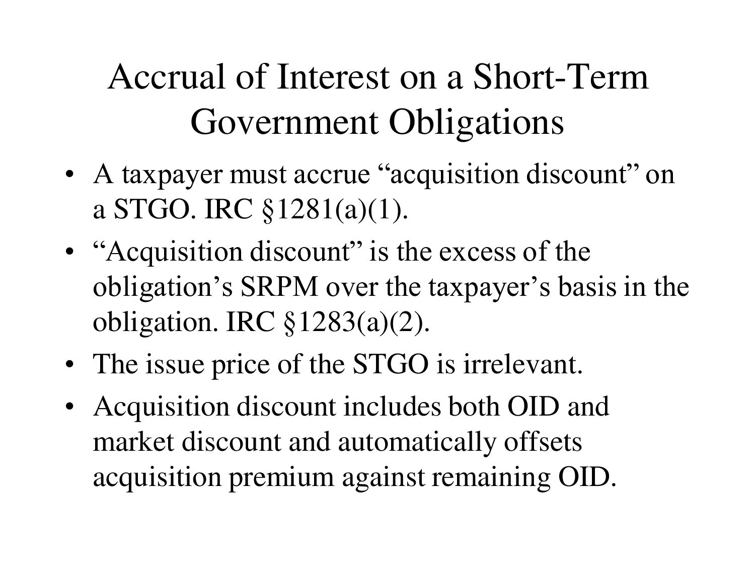 taxpayer must accrue “acquisition discount” on a STGO. IRC §1281(a)(1). • “Acquisition discount” is the excess of the obligation’s SRPM over the taxpayer’s basis in the obligation. IRC §1283(a)(2). • The issue price of the STGO is irrelevant. • Acquisition discount includes both OID and market discount and automatically offsets acquisition premium against remaining OID.