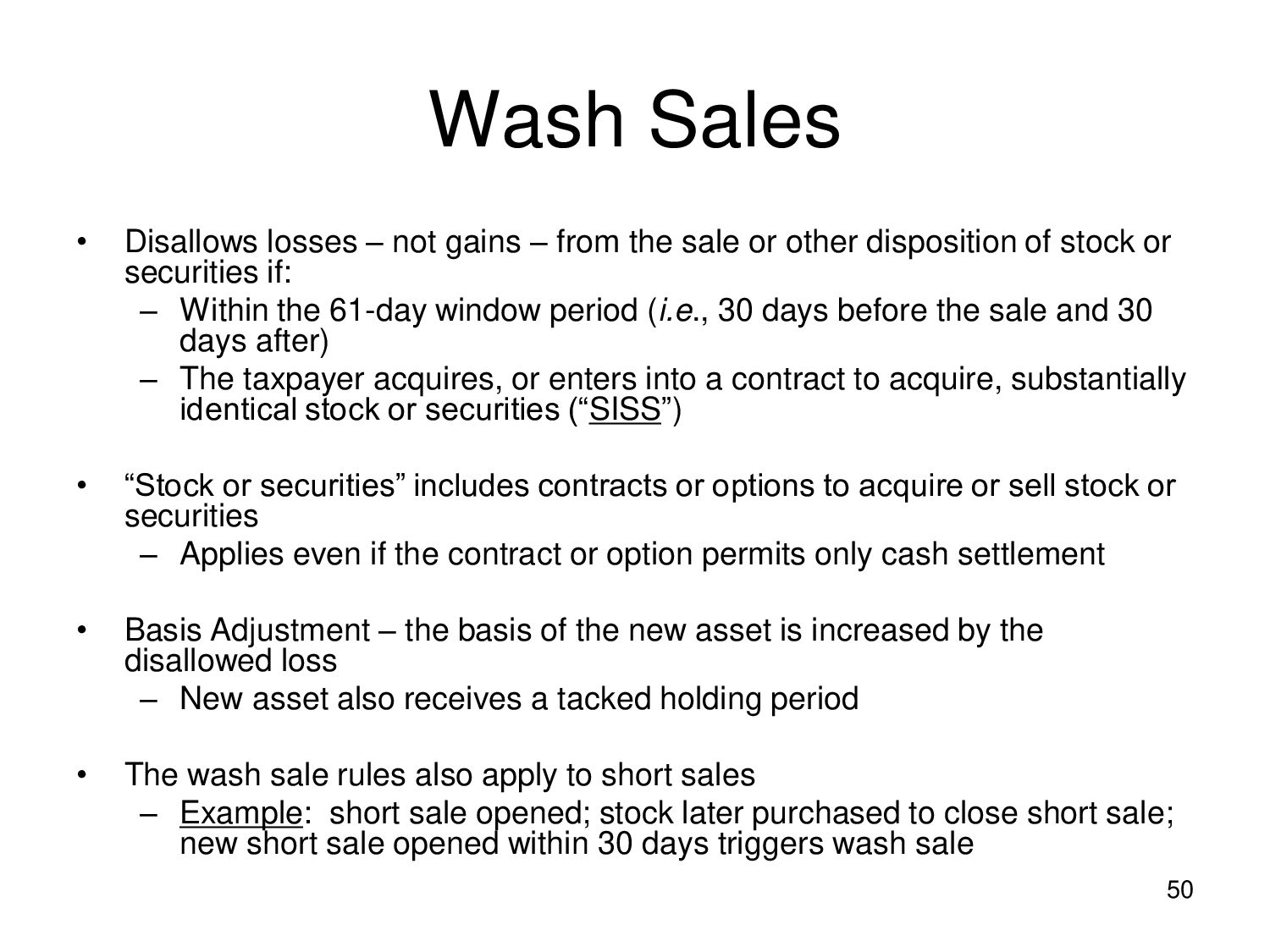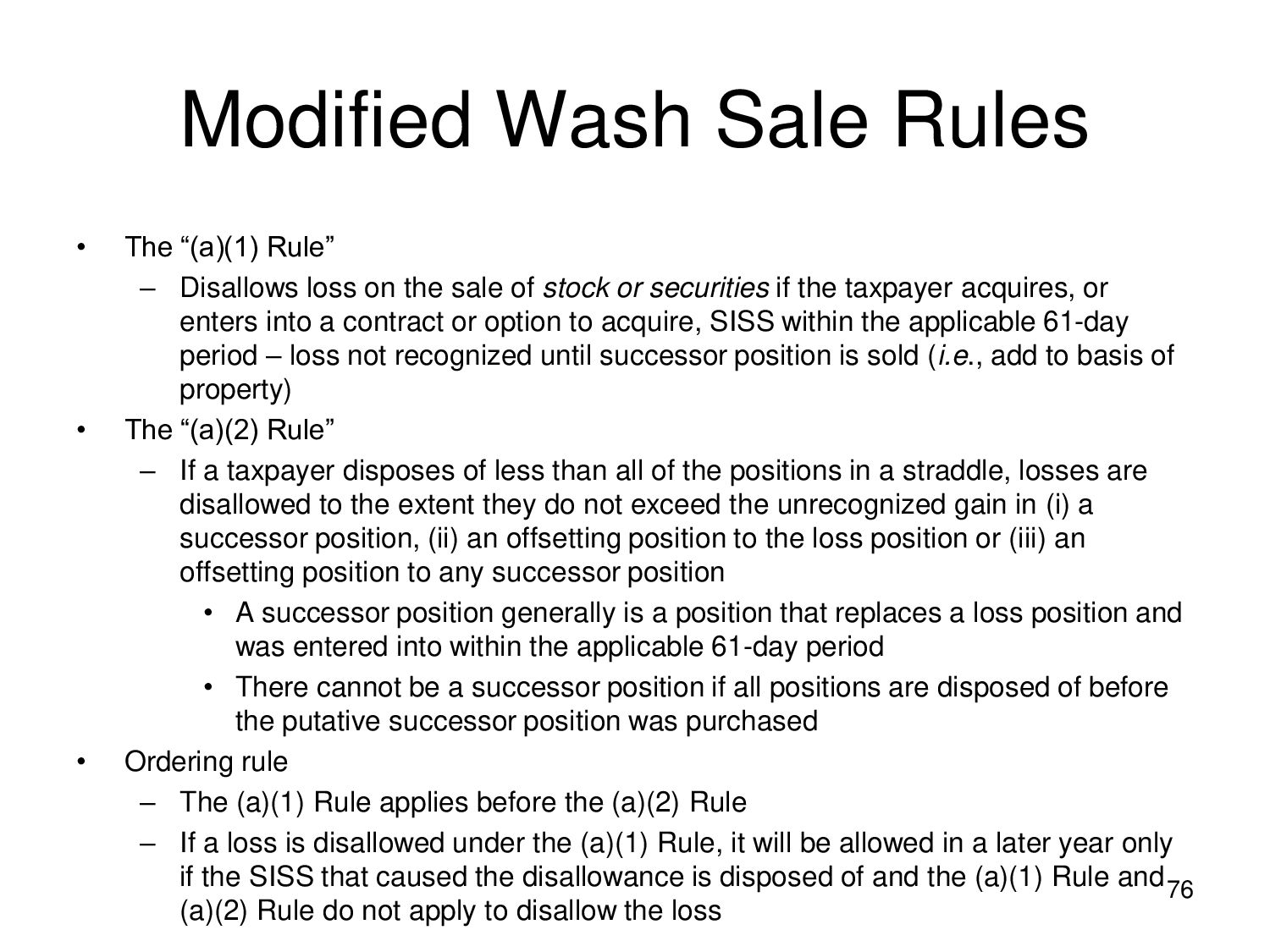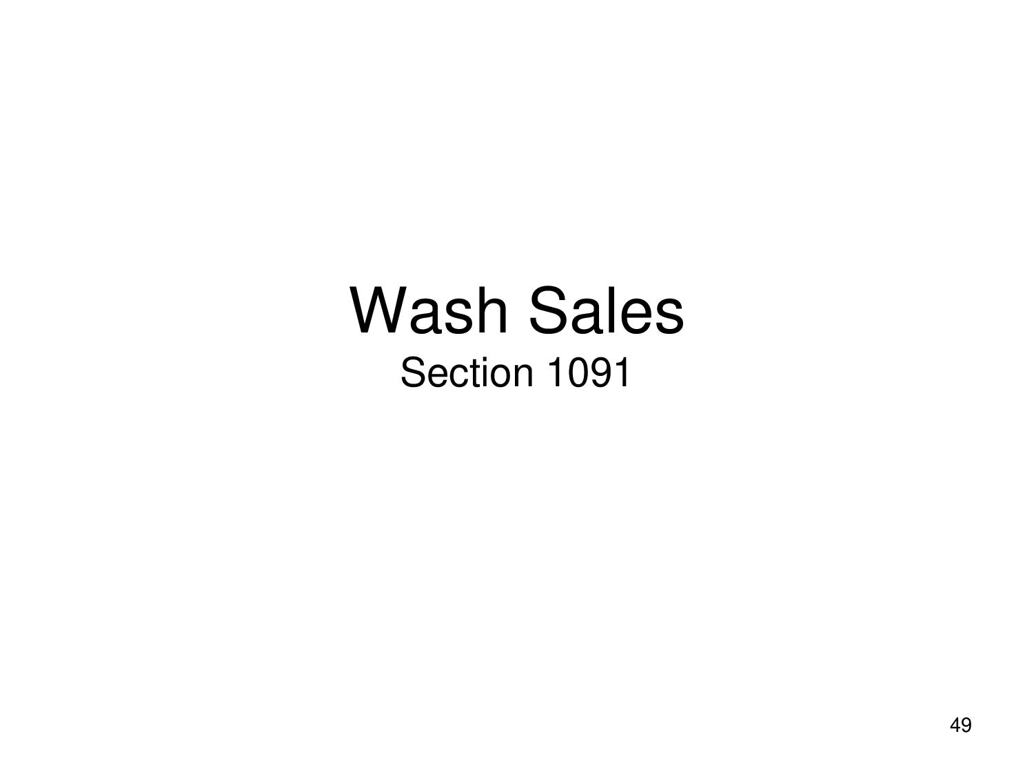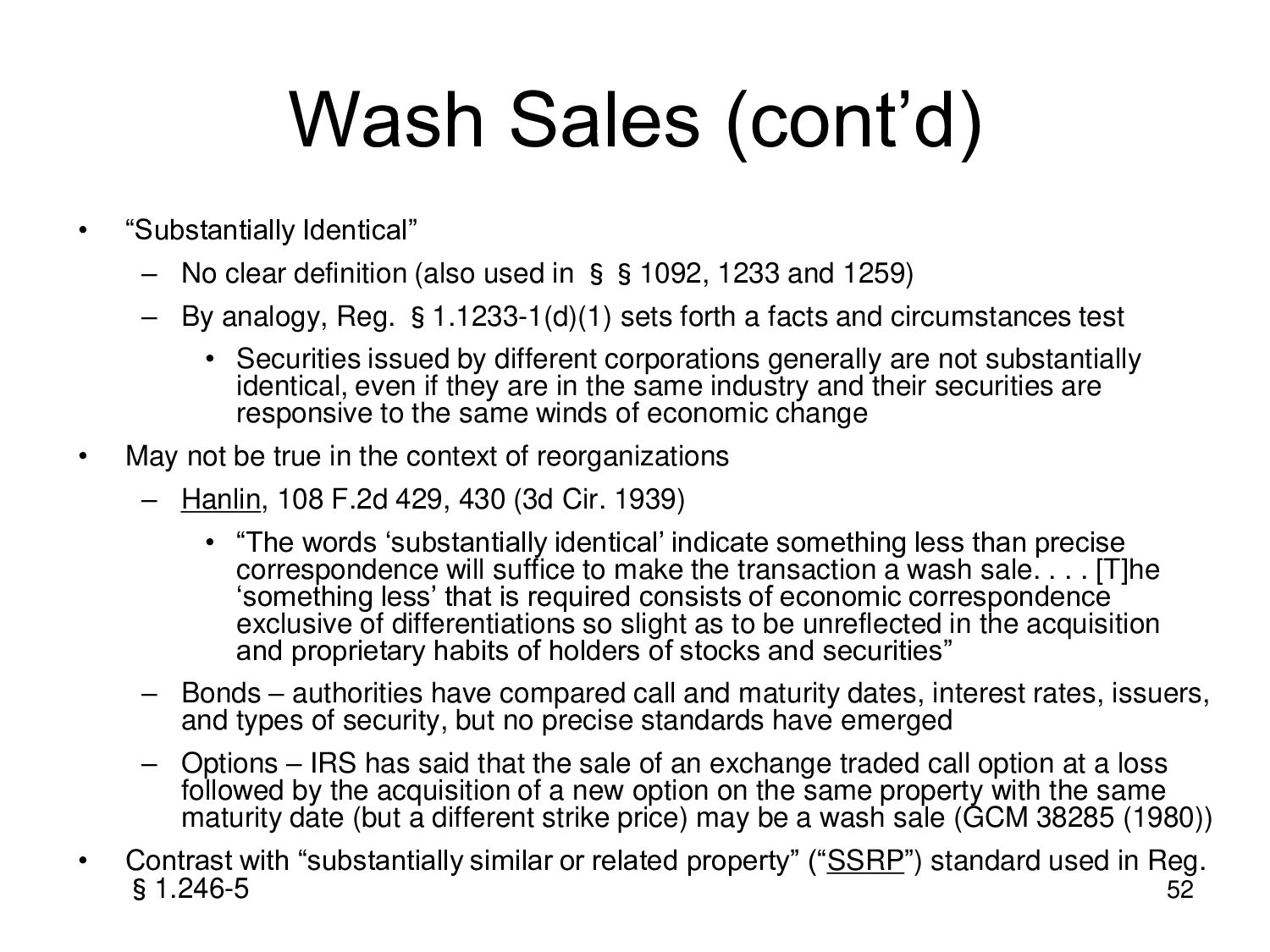 (also used in §§1092, 1233 and 1259) – By analogy, Reg. §1.1233-1(d)(1) sets forth a facts and circumstances test • Securities issued by different corporations generally are not substantially identical, even if they are in the same industry and their securities are responsive to the same winds of economic change • May not be true in the context of reorganizations – Hanlin, 108 F.2d 429, 430 (3d Cir. 1939) • “The words ‘substantially identical’ indicate something less than precise correspondence will suffice to make the transaction a wash sale. . . . [T]he ‘something less’ that is required consists of economic correspondence exclusive of differentiations so slight as to be unreflected in the acquisition and proprietary habits of holders of stocks and securities” – Bonds – authorities have compared call and maturity dates, interest rates, issuers, and types of security, but no precise standards have emerged – Options – IRS has said that the sale of an exchange traded call option at a loss followed by the acquisition of a new option on the same property with the same maturity date (but a different strike price) may be a wash sale (GCM 38285 (1980)) • Contrast with “substantially similar or related property” (“SSRP”) standard used in Reg. §1.246-5 52