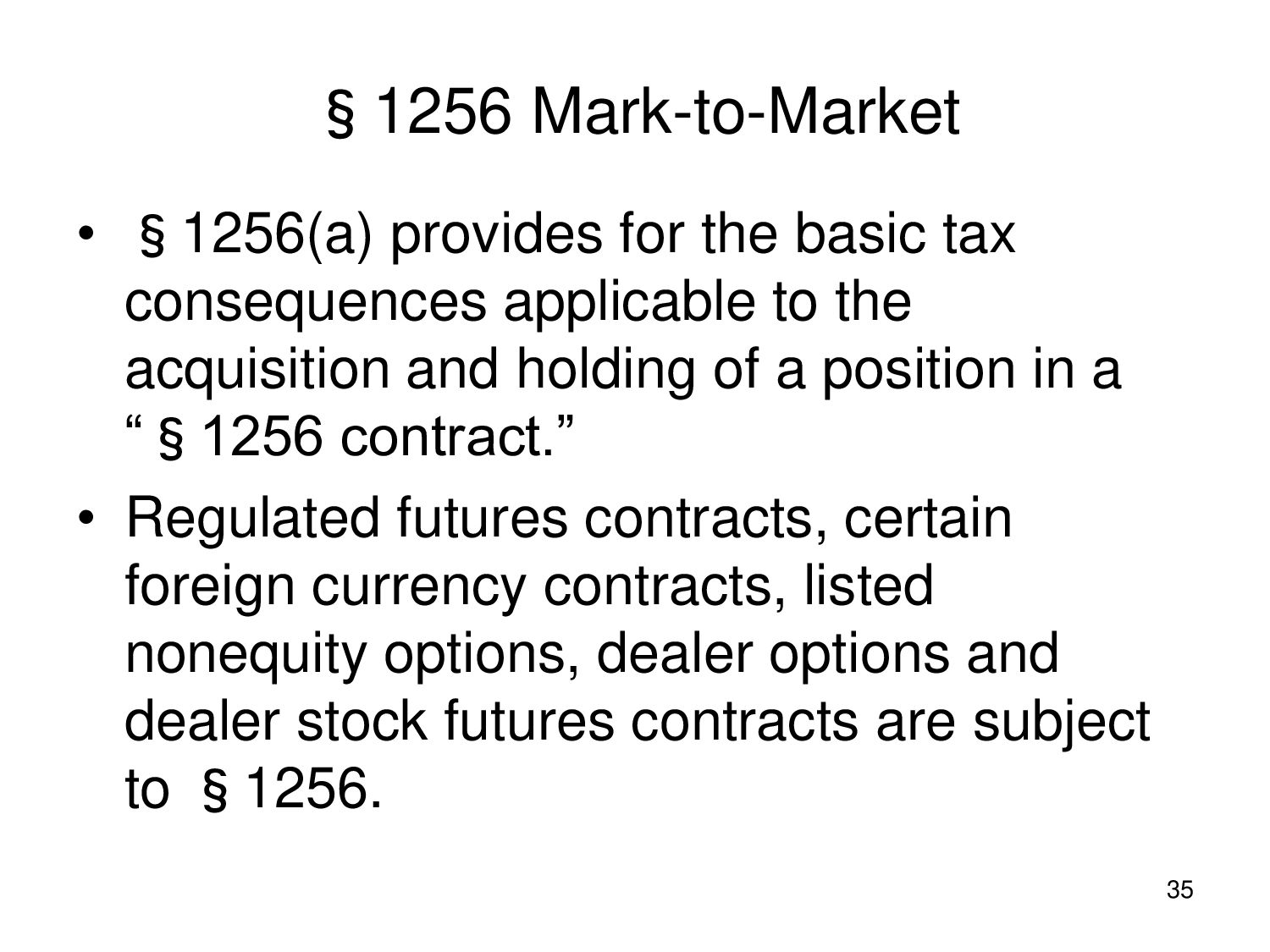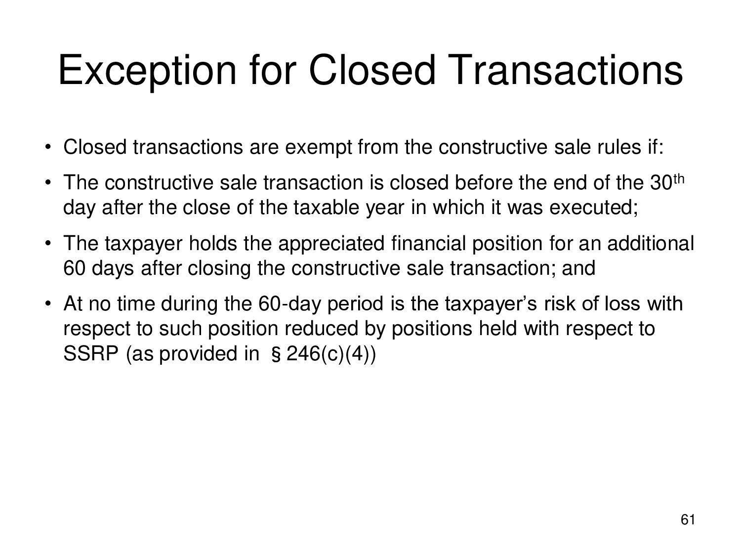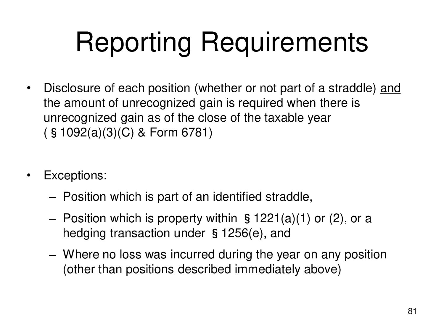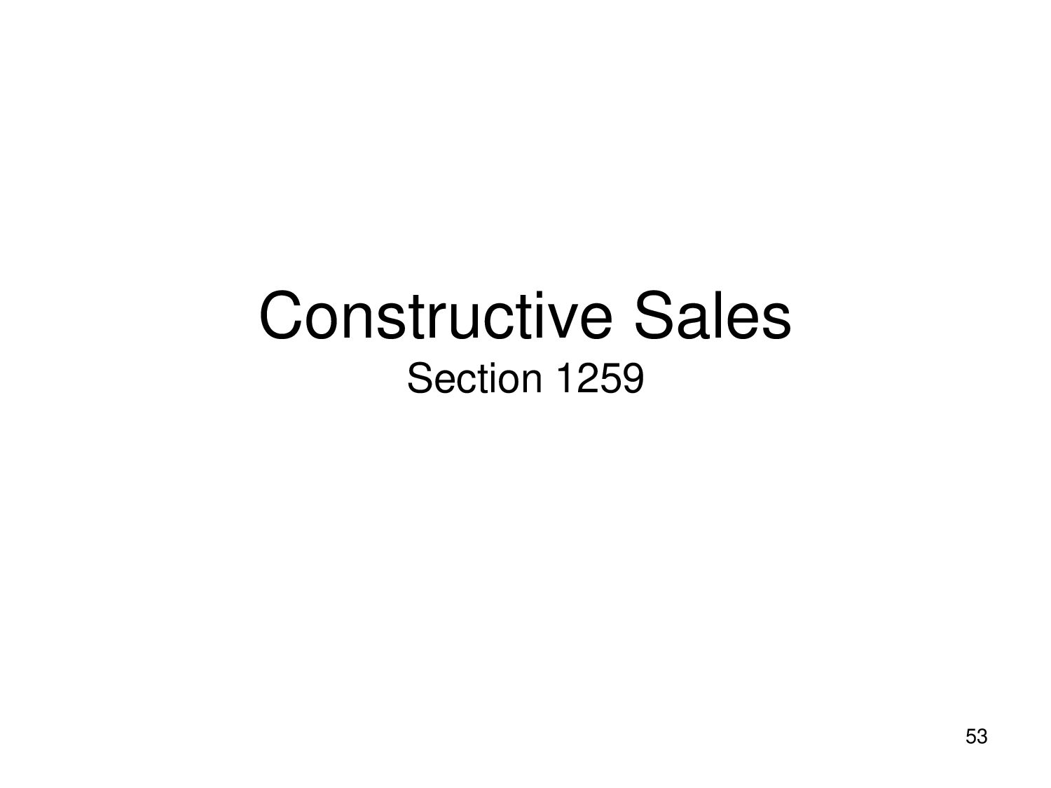 (also used in §§1092, 1233 and 1259) – By analogy, Reg. §1.1233-1(d)(1) sets forth a facts and circumstances test • Securities issued by different corporations generally are not substantially identical, even if they are in the same industry and their securities are responsive to the same winds of economic change • May not be true in the context of reorganizations – Hanlin, 108 F.2d 429, 430 (3d Cir. 1939) • “The words ‘substantially identical’ indicate something less than precise correspondence will suffice to make the transaction a wash sale. . . . [T]he ‘something less’ that is required consists of economic correspondence exclusive of differentiations so slight as to be unreflected in the acquisition and proprietary habits of holders of stocks and securities” – Bonds – authorities have compared call and maturity dates, interest rates, issuers, and types of security, but no precise standards have emerged – Options – IRS has said that the sale of an exchange traded call option at a loss followed by the acquisition of a new option on the same property with the same maturity date (but a different strike price) may be a wash sale (GCM 38285 (1980)) • Contrast with “substantially similar or related property” (“SSRP”) standard used in Reg. §1.246-5 52