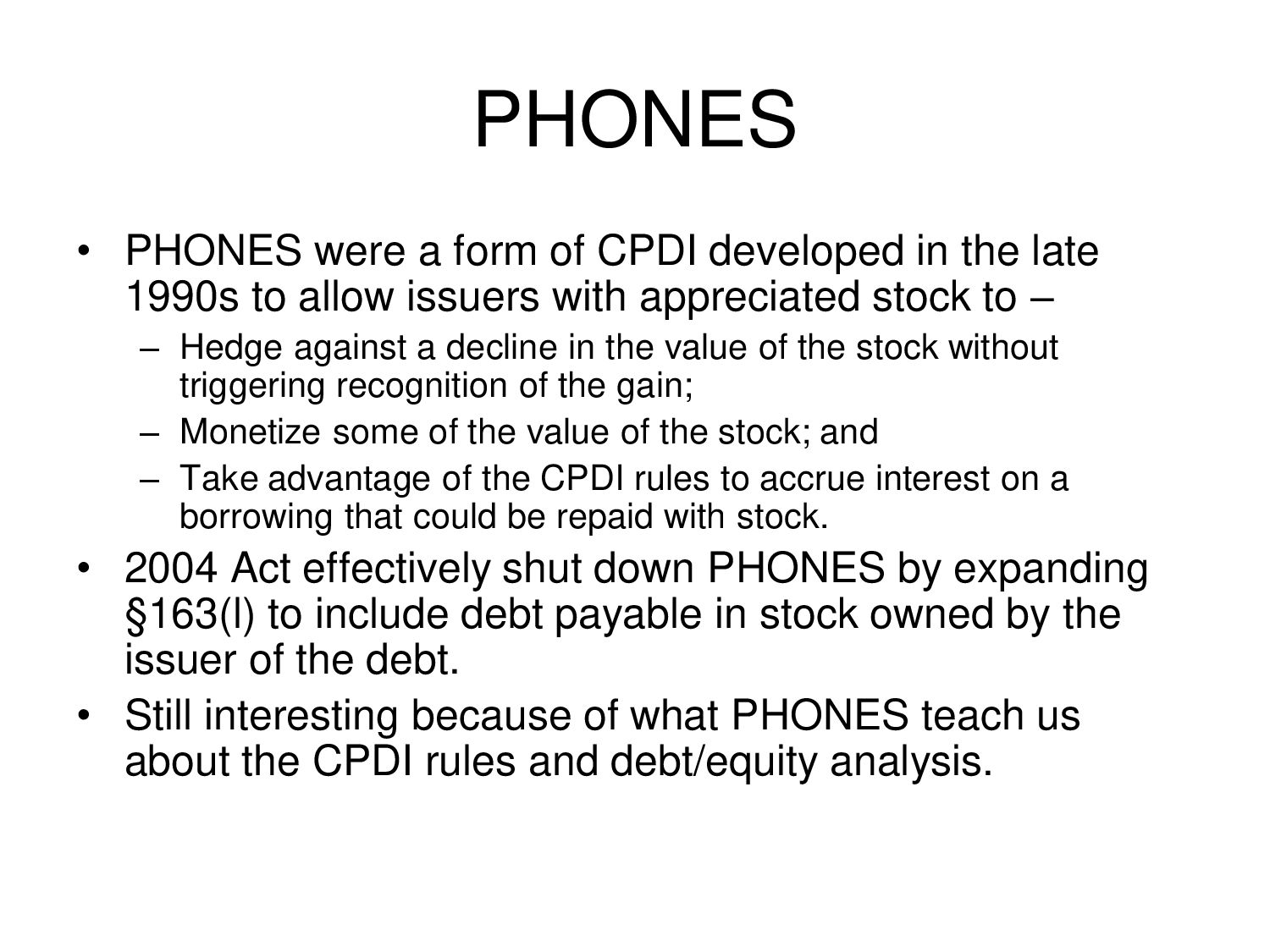 the late 1990s to allow issuers with appreciated stock to – – Hedge against a decline in the value of the stock without triggering recognition of the gain; – Monetize some of the value of the stock; and – Take advantage of the CPDI rules to accrue interest on a borrowing that could be repaid with stock. • 2004 Act effectively shut down PHONES by expanding §163(l) to include debt payable in stock owned by the issuer of the debt. • Still interesting because of what PHONES teach us about the CPDI rules and debt/equity analysis.
