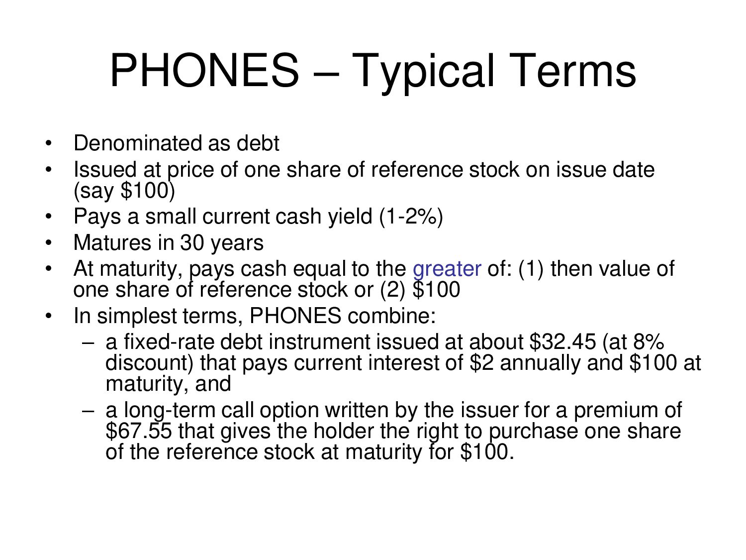 at price of one share of reference stock on issue date (say $100) • Pays a small current cash yield (1-2%) • Matures in 30 years • At maturity, pays cash equal to the greater of: (1) then value of one share of reference stock or (2) $100 • In simplest terms, PHONES combine: – a fixed-rate debt instrument issued at about $32.45 (at 8% discount) that pays current interest of $2 annually and $100 at maturity, and – a long-term call option written by the issuer for a premium of $67.55 that gives the holder the right to purchase one share of the reference stock at maturity for $100.